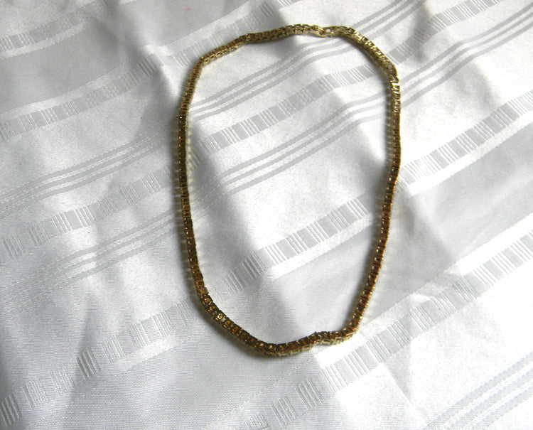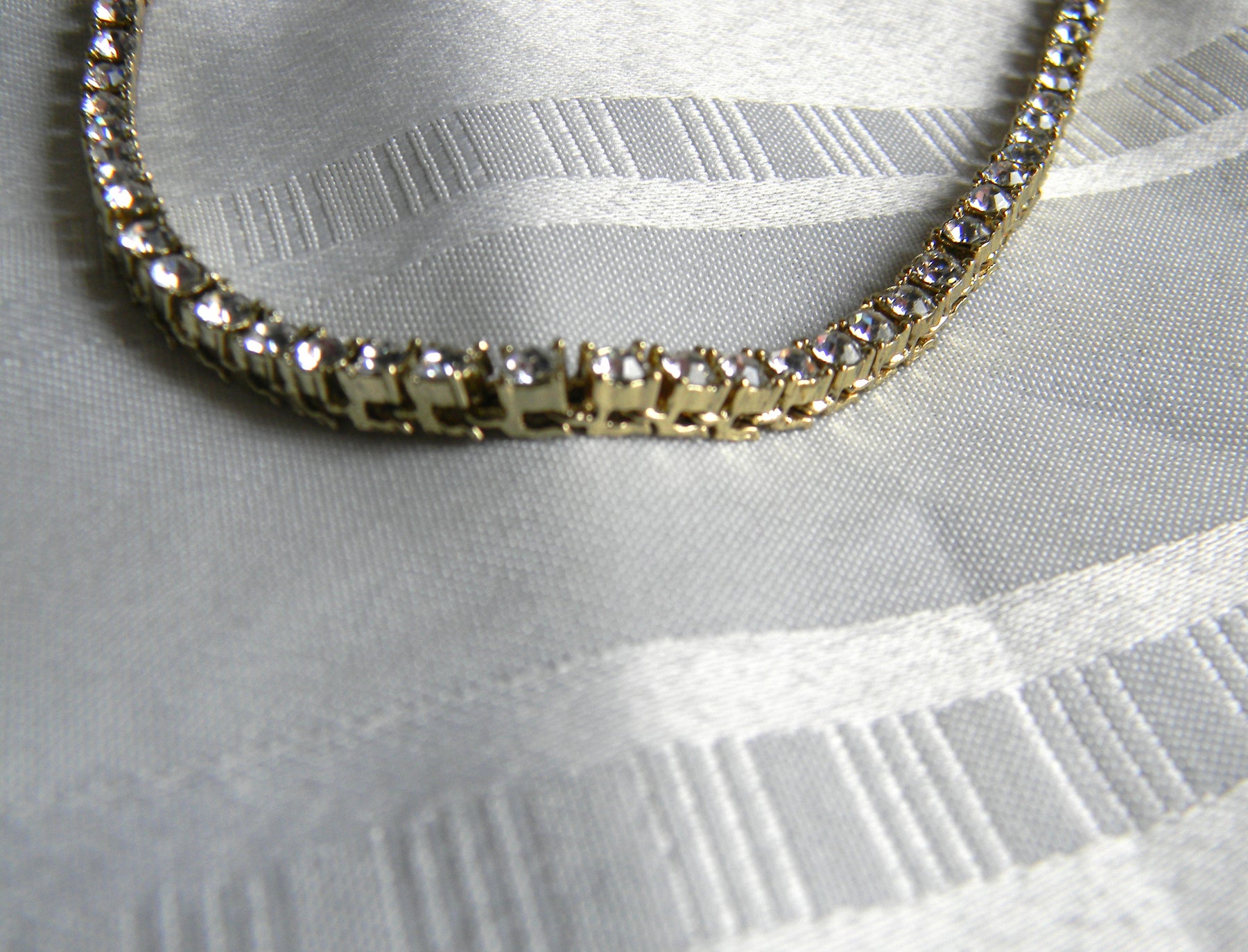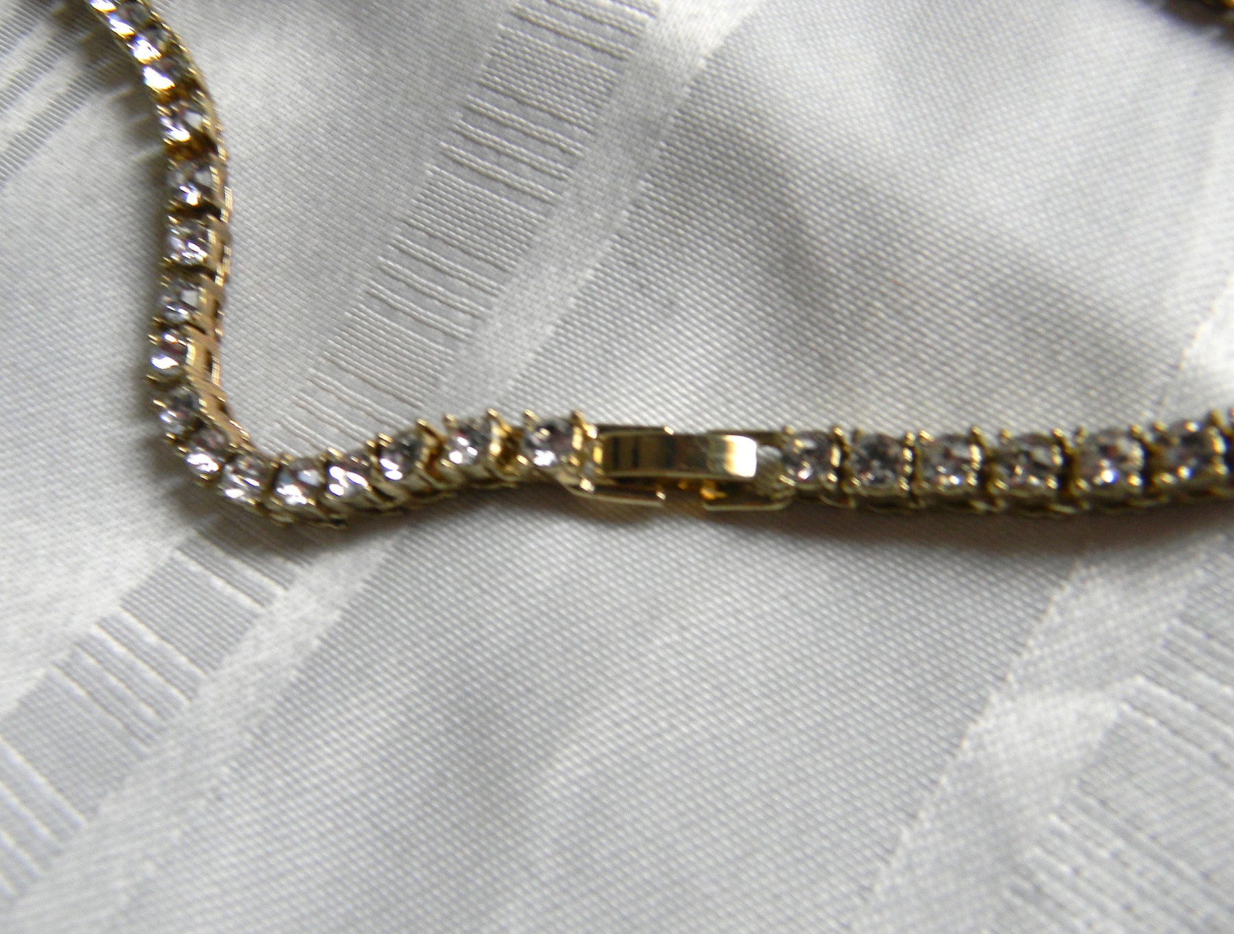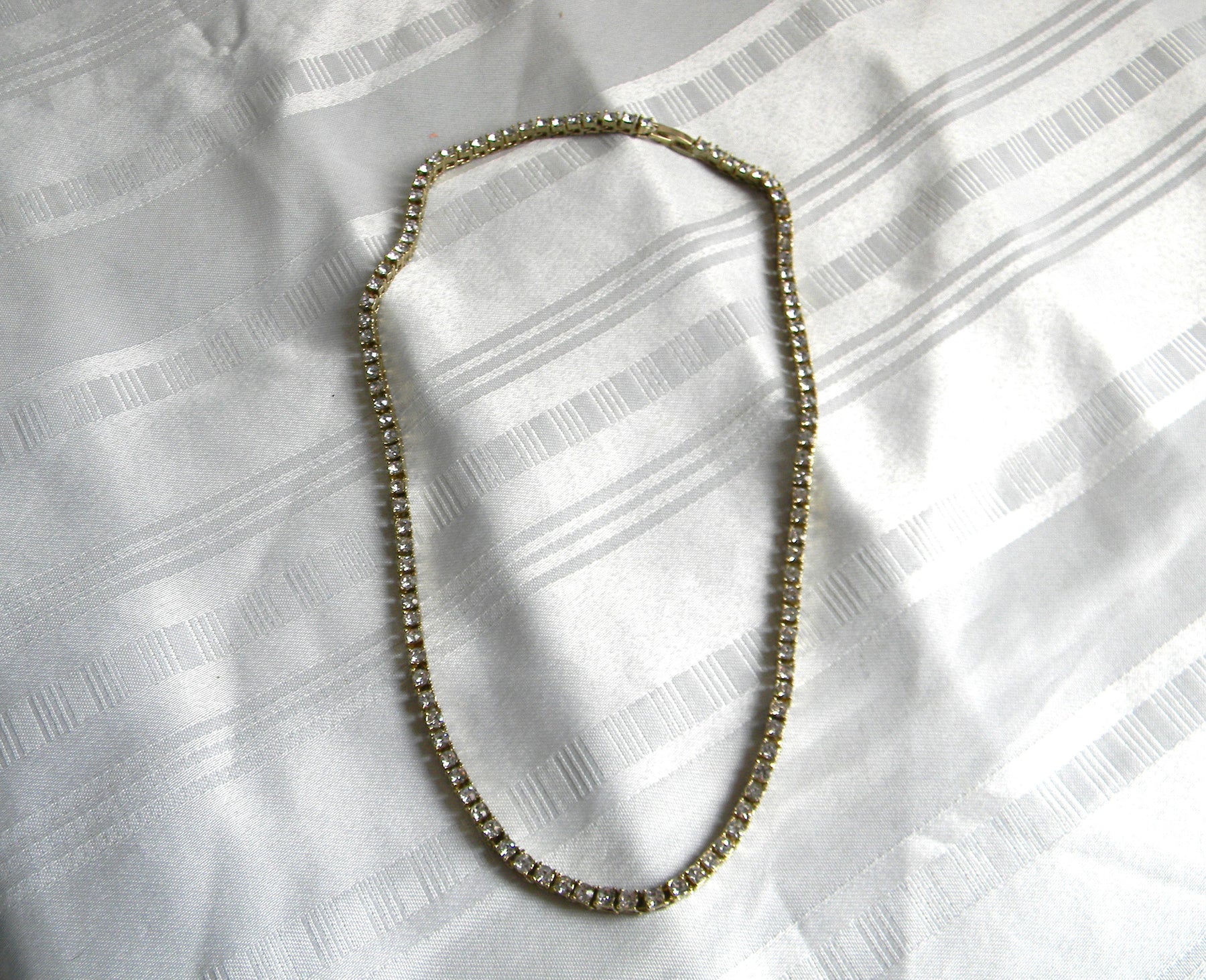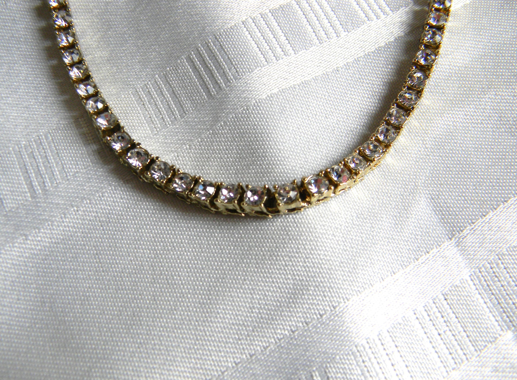 Stunning rhinestone necklace with each stone individually set.  The metal is in gold tone with a fold over clasp.