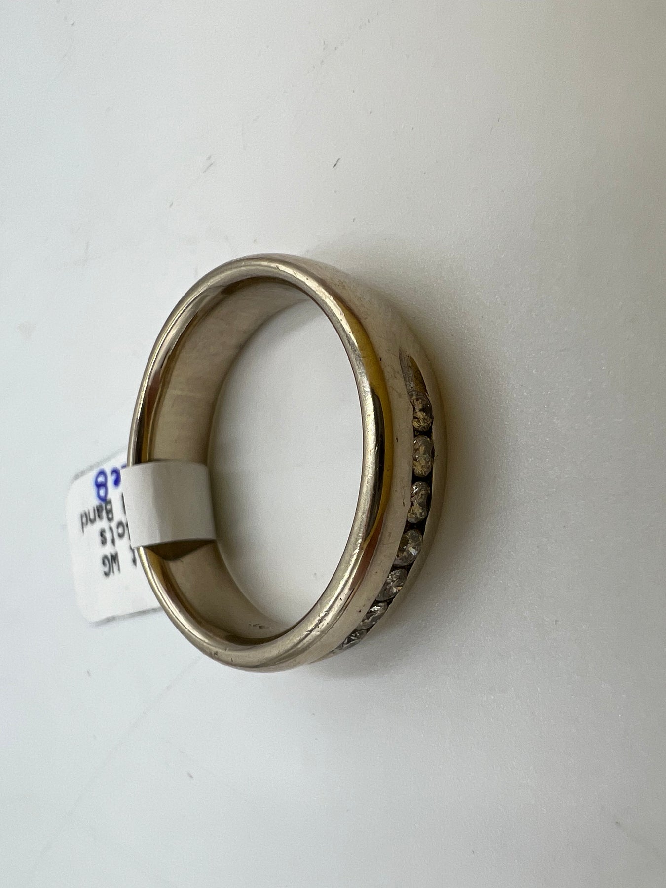 Unisex, primarily male, wedding band. 14kt white gold, diamonds are .14cts. Size 8.