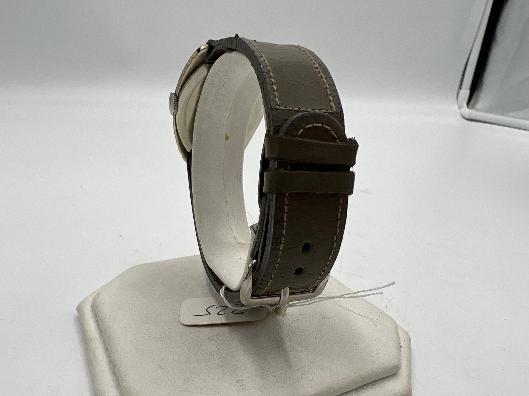 27mm case size with a leather band width of 16mm. 14k gold filled case. Manual wind. Small seconds feature. 31.6 grams.