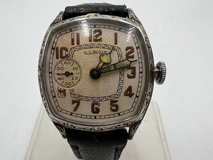 The Illinois "Beau Brummel" 14k Gold 17 Jewel Wrist Watch is a classic timepiece that exudes sophistication. The elegant design features a black leather strap and a white dial with 17 jewels, making it a perfect accessory for any dress/formal occasion. This wristwatch is a great addition to any watch collection and showcases the Illinois brand's quality and craftsmanship. Its sleek and timeless style will never go out of fashion.