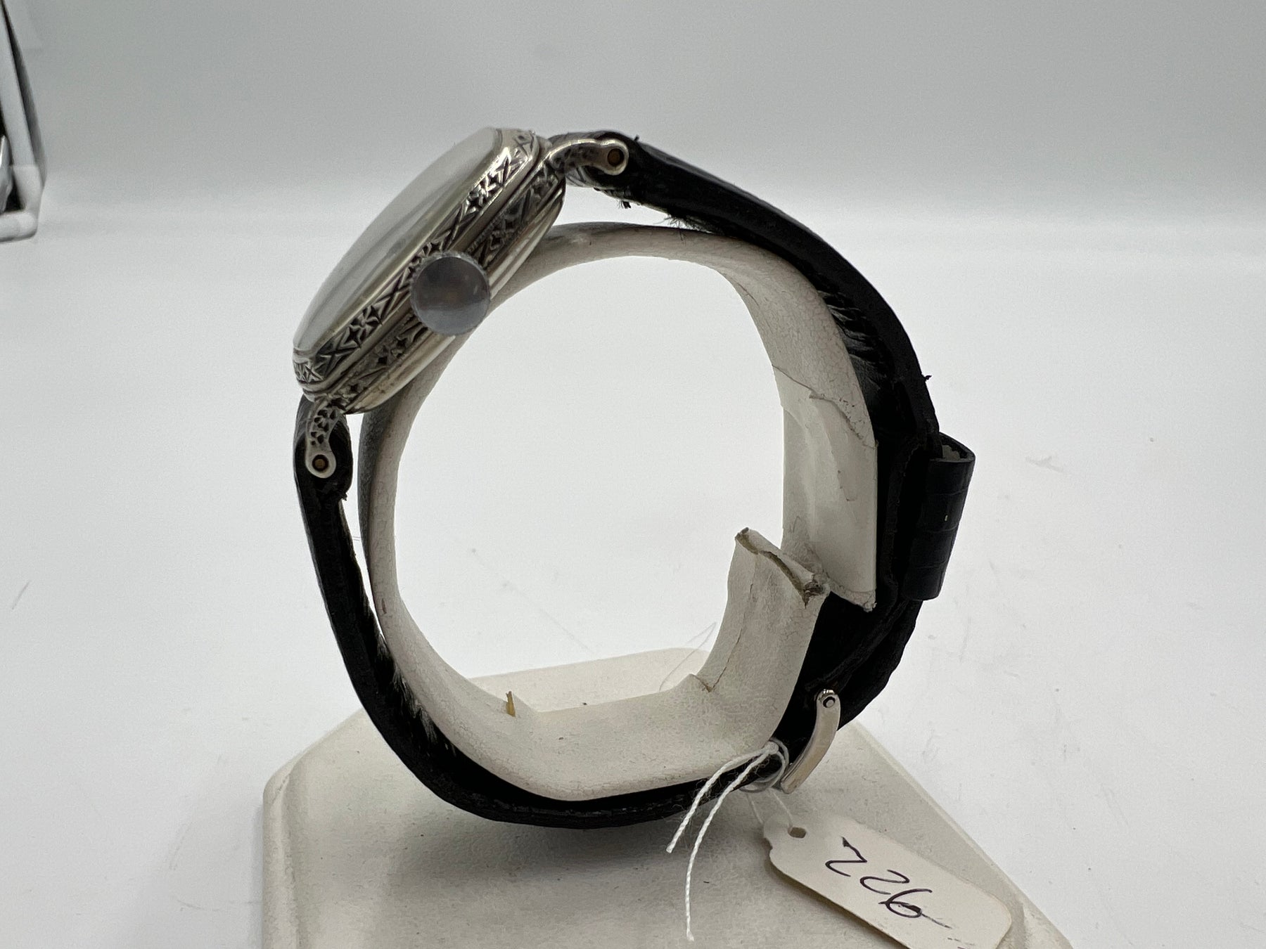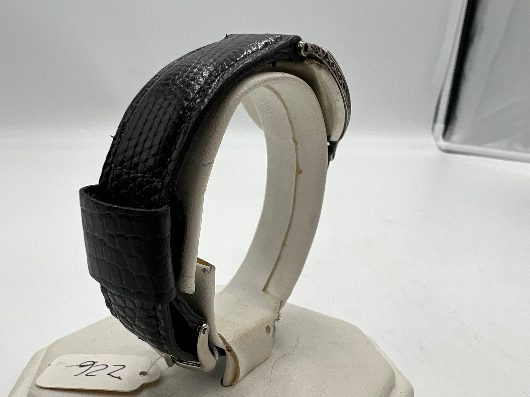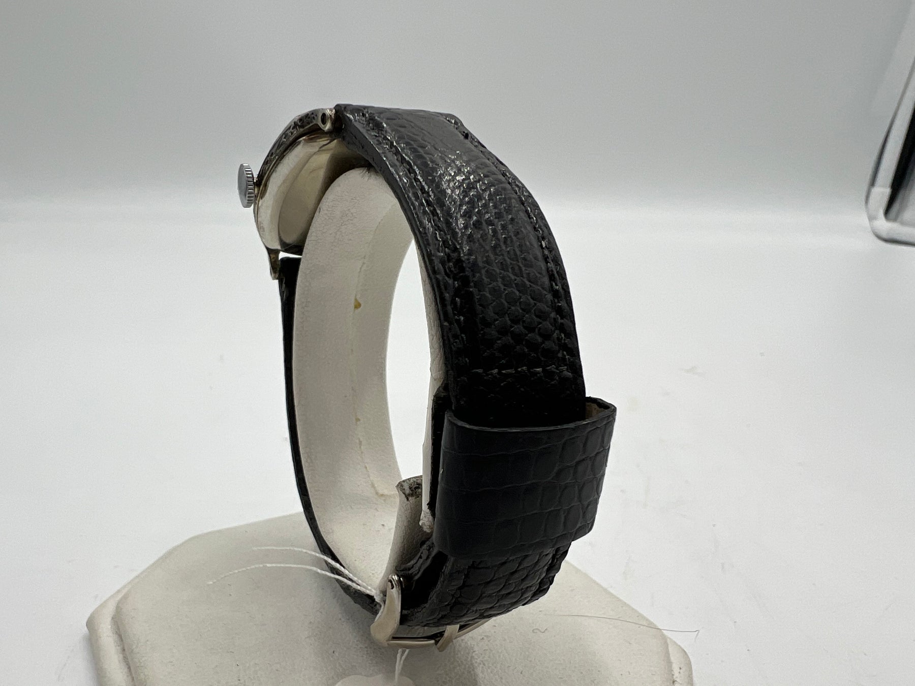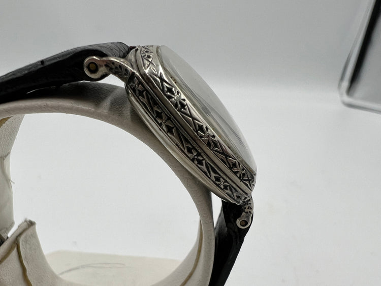 28mm case size with a band width of 16mm. Case is 14k white gold with a black lizard band. Watch has an etching/inscription on the back. 29.7 grams. Manual wind movement. 17 jewels