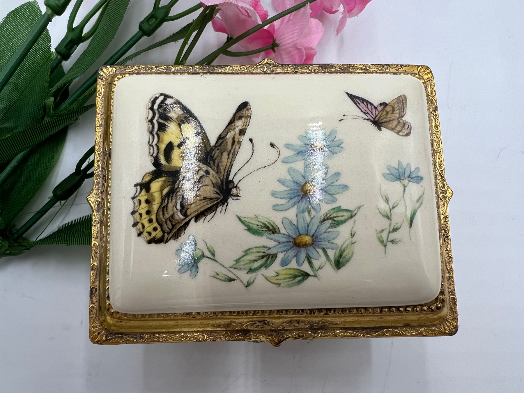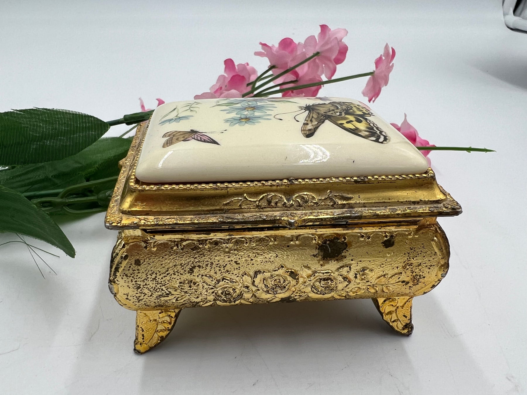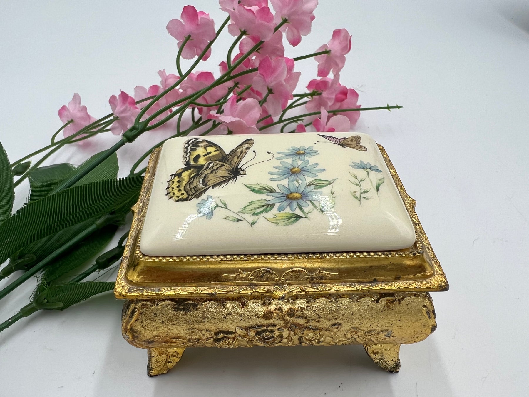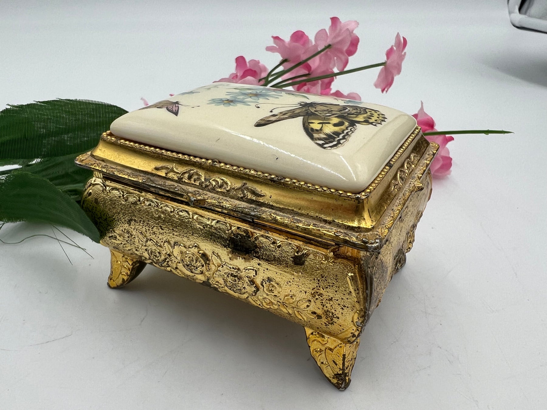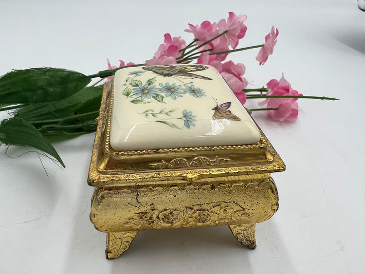 This elegant trinket box will add a touch of sophistication to any room. The stunning gold tone finish and intricate butterfly design make it a beautiful piece for any collector or decorator. The metal construction ensures durability and longevity. Perfect for storing small treasures or as a decorative piece on a shelf or table.