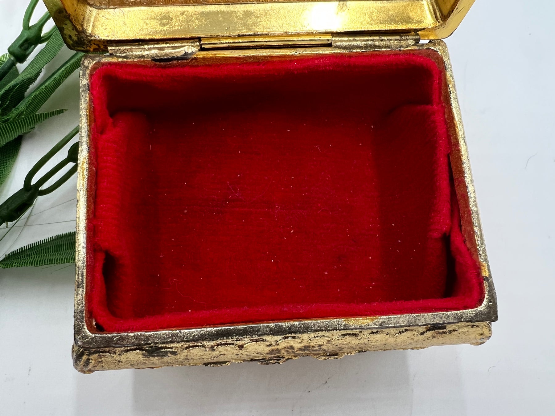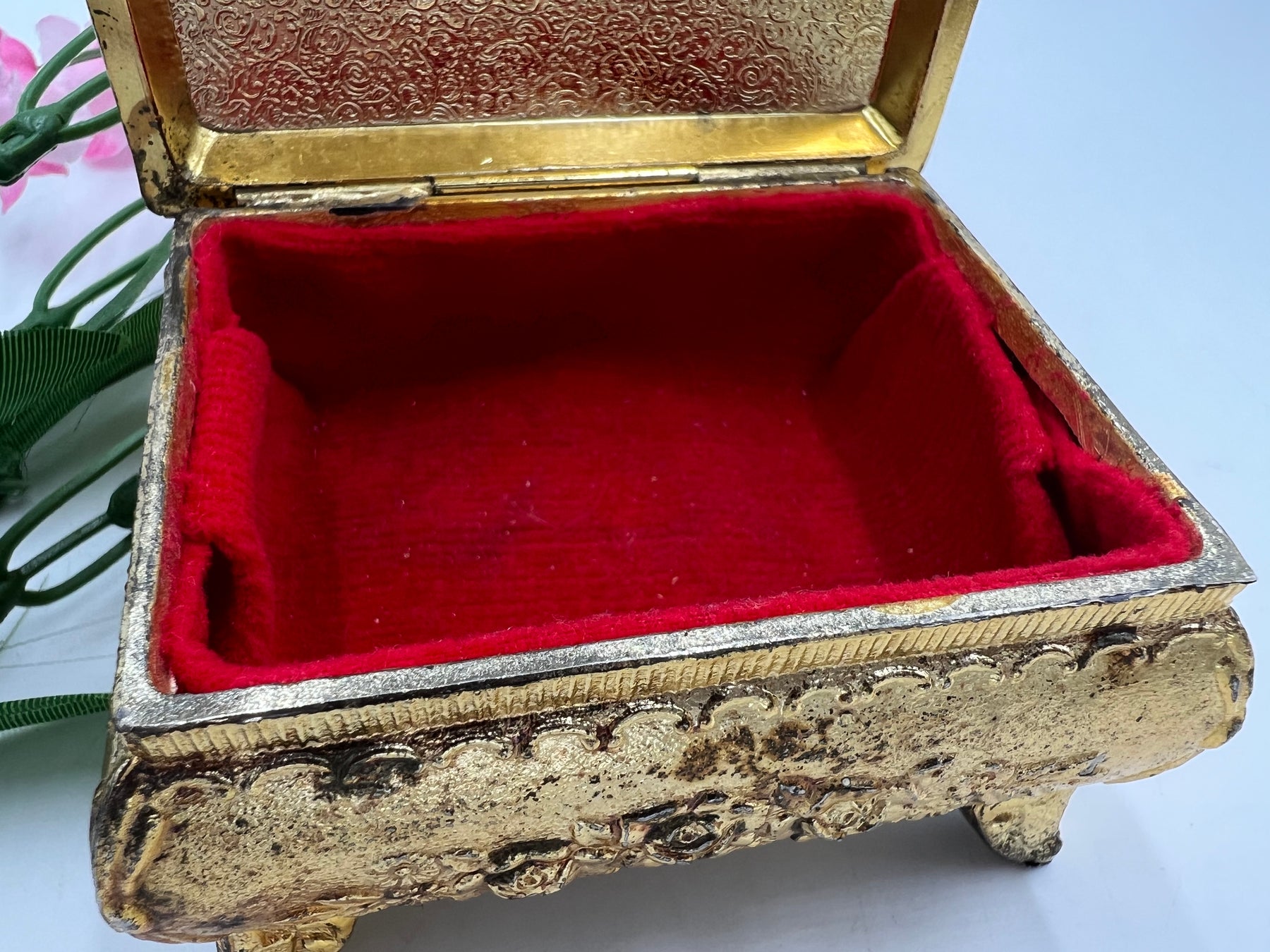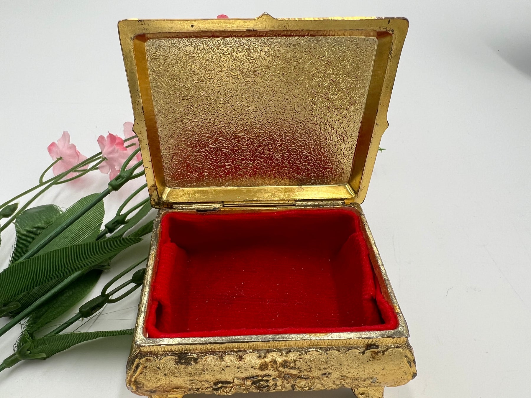 This trinket box is perfect for small pieces of jewelry or small collectables. It weighs about 2 or 3 pounds. It has a gold tone finish but it is not real gold. It has a red velvet inlay within the box. Does not indicate any brand. It is 8 cm by 6.5 cm by 5.5 cm.