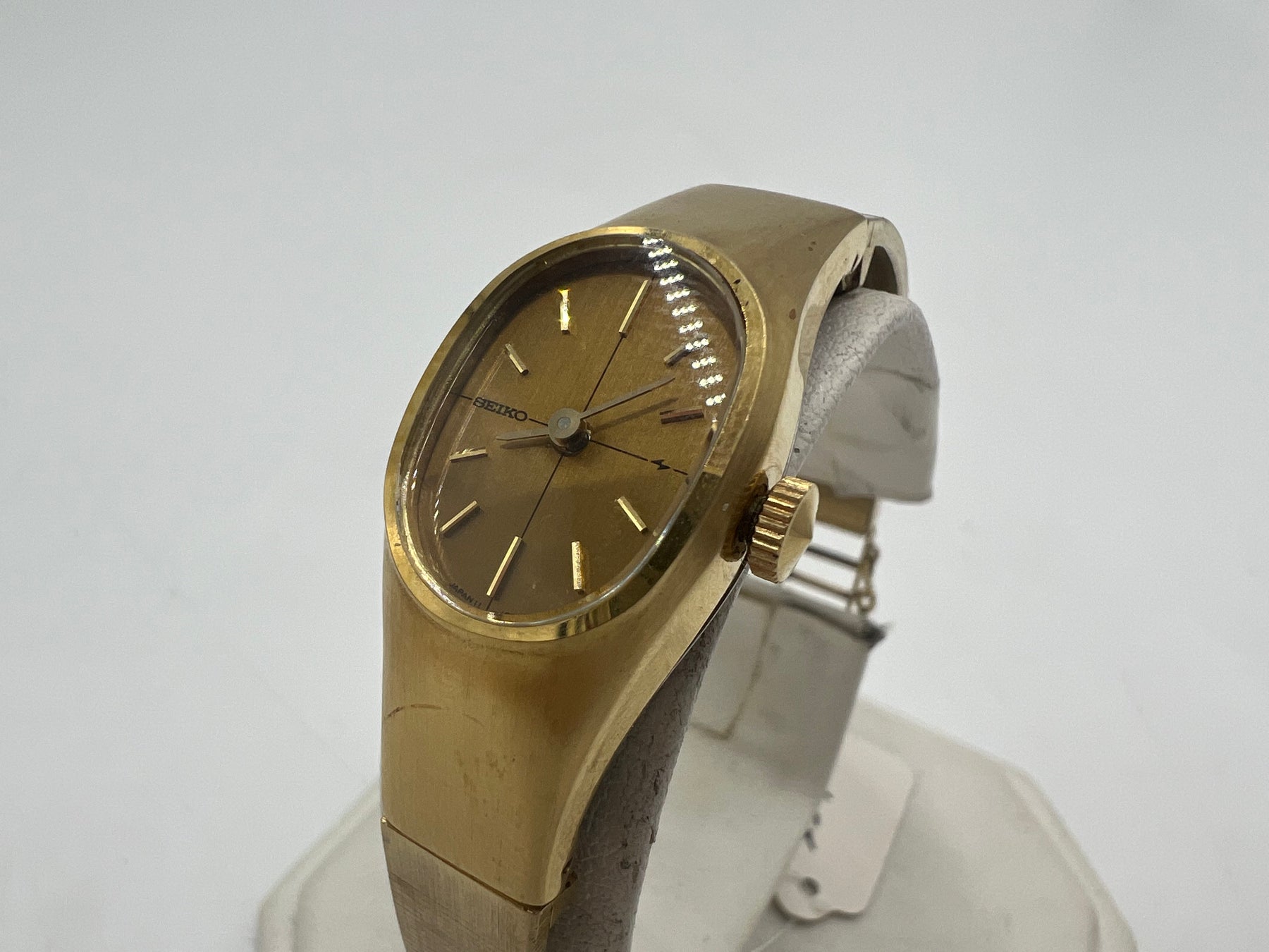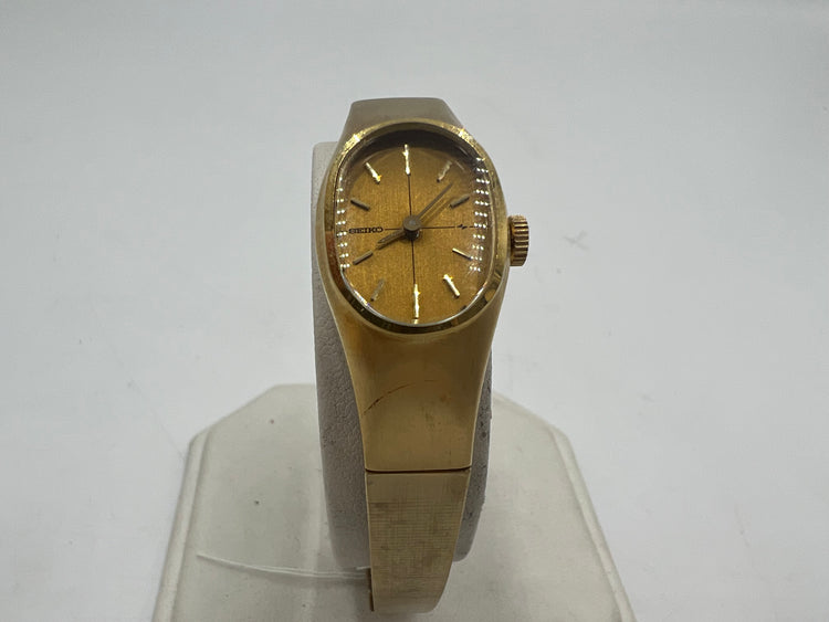 This stunning wristwatch from Seiko is a timeless piece that will complement any style. The gold-tone dial and stainless steel band give it a classic and elegant look. It features a mechanical manual movement for reliable timekeeping. This women's wristwatch is perfect for both casual and formal occasions and is sure to make a statement. The model number is 11-7669 and it is a Seiko vintage piece.