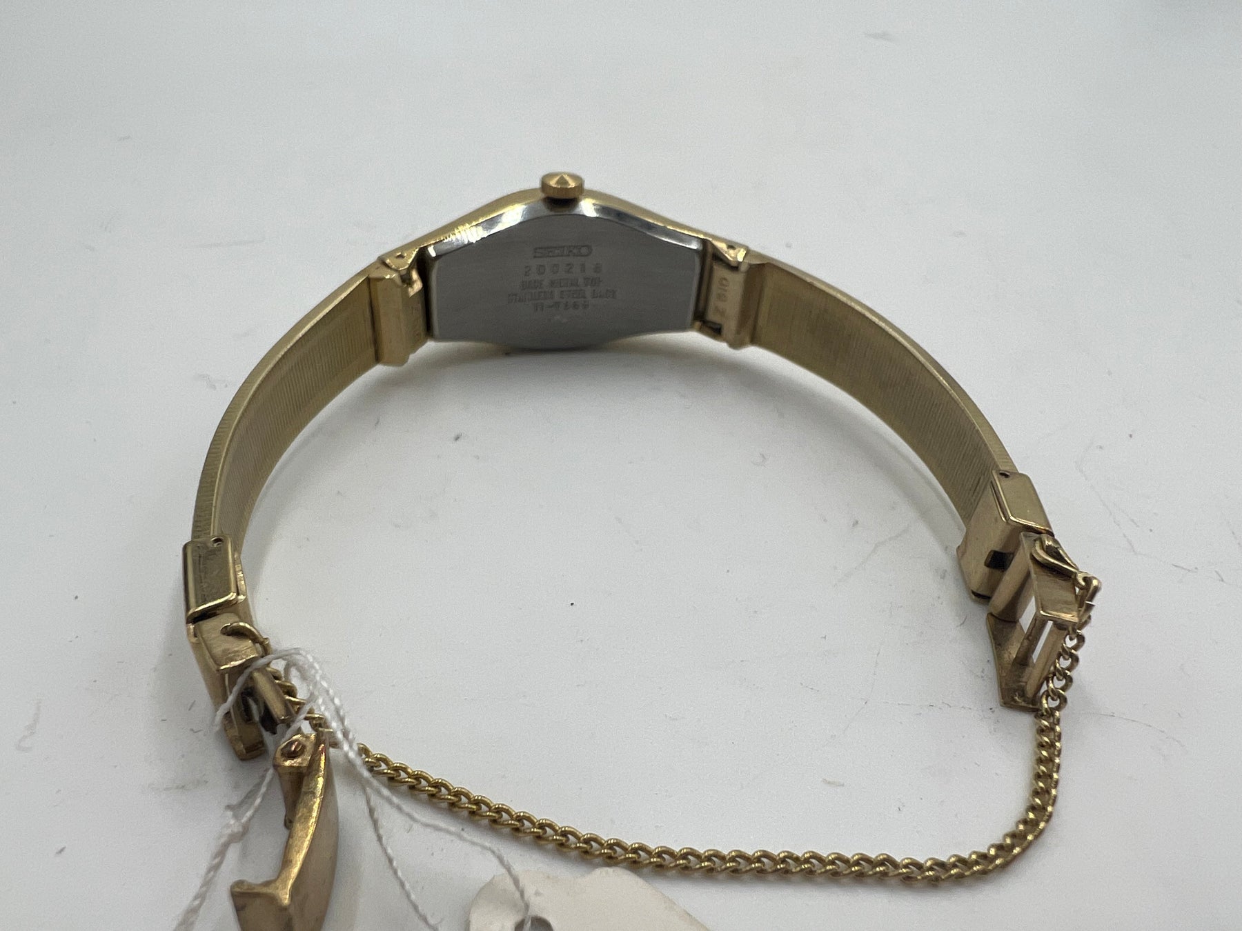 This beautiful Seiko vintage time piece is perfect for the special lady in your life! It is gold toned with a stainless steel base. It is a mechanical (manual wind) wrist watch. The dial diameter is 16mm and the band width is 9mm. The diameter of the watch band is 5cm. 28.6 grams.