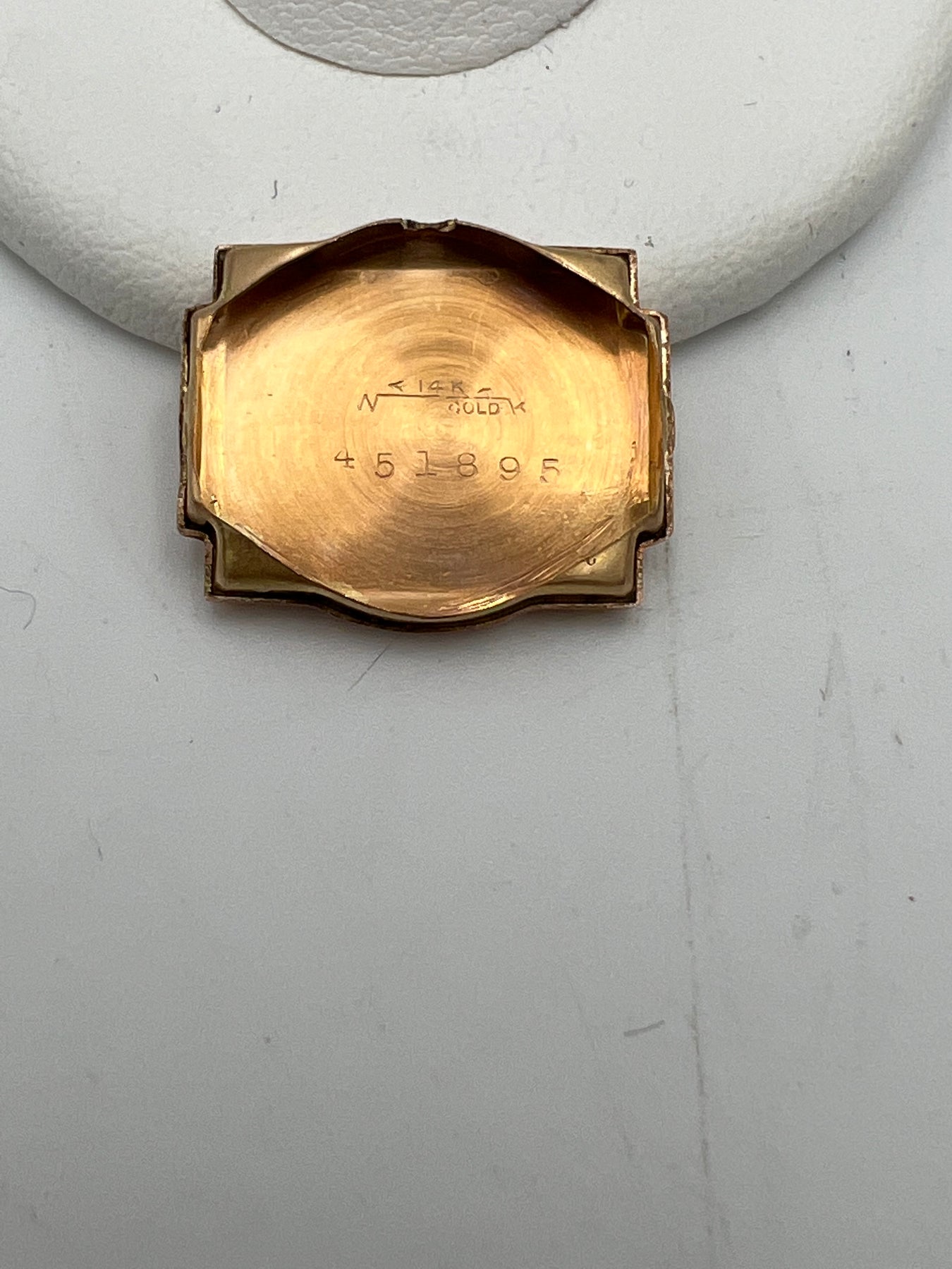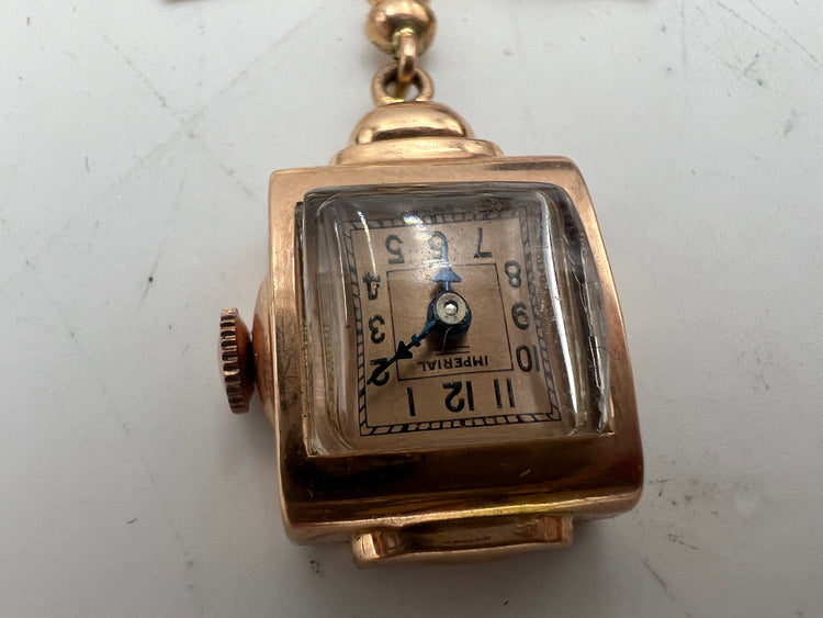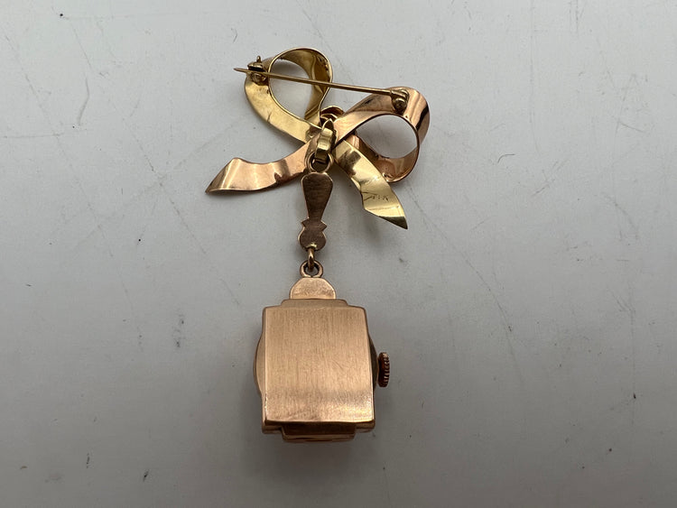 The watch and the pin are 14kt rose gold. The watch is upside down to give those wearing it the ability to see the time by looking down. It is a manual wind watch. The dial is 15mm. the length is 55mm, the weight is 10.8 grams.