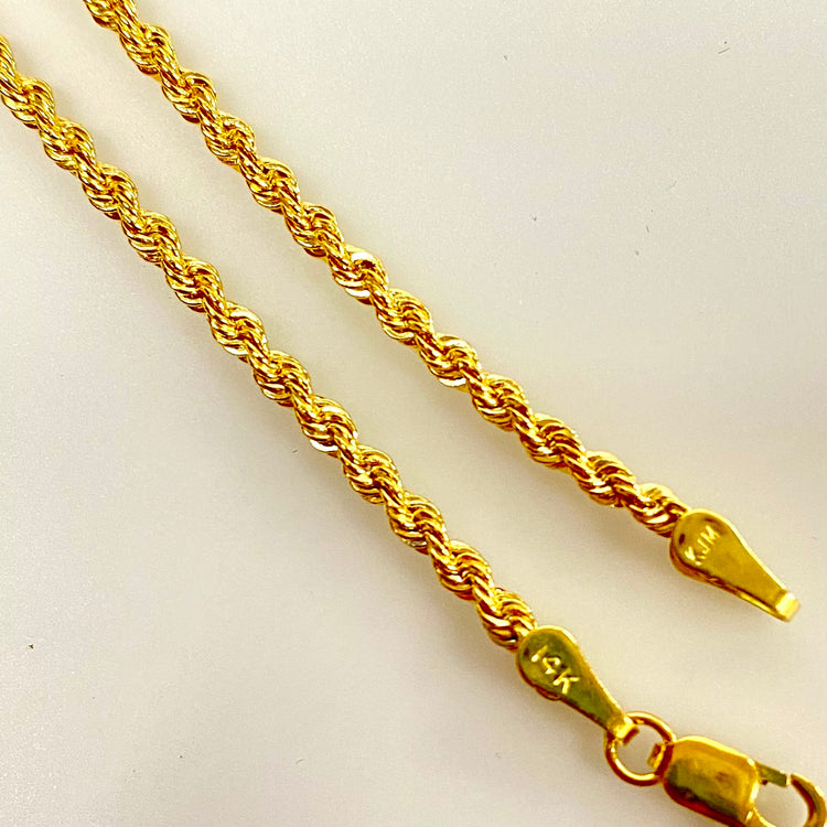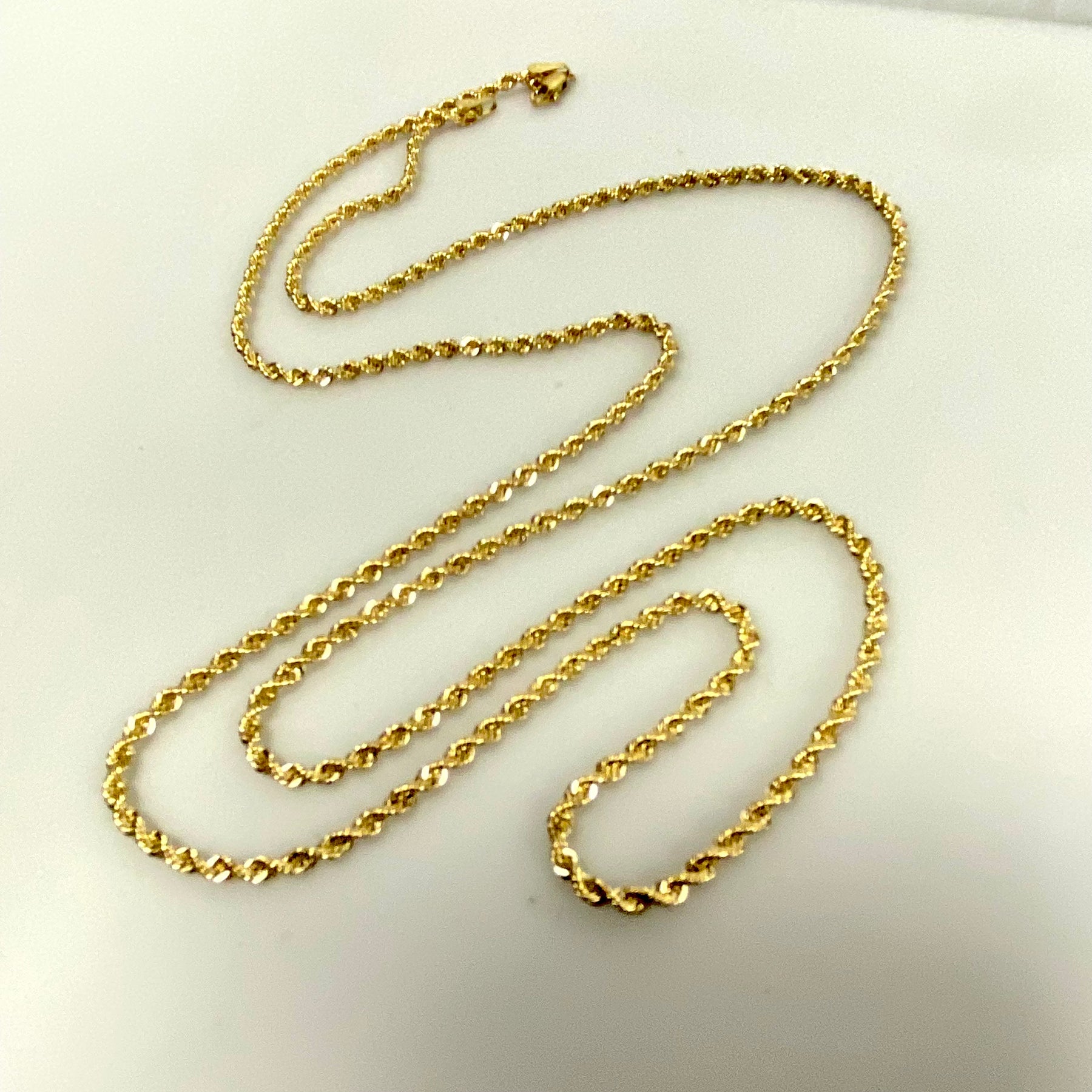 * 14K Yellow Gold Chain Necklace. Rope style links. 29.5" long, 2.4mm wide.