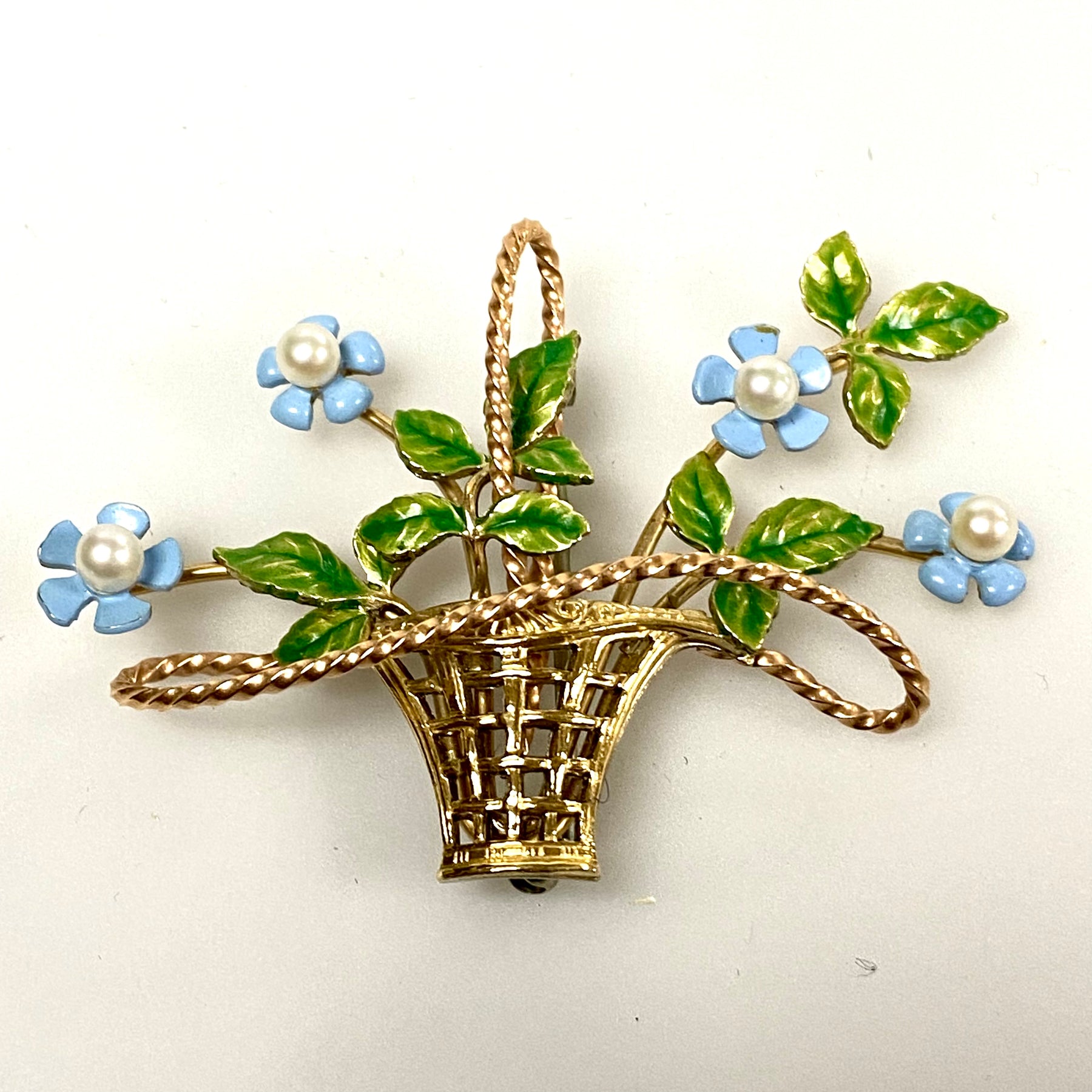 u845 Vintage Krementz Gold Filled Pearl and Enamel Flower Basket Brooch Pin 50's