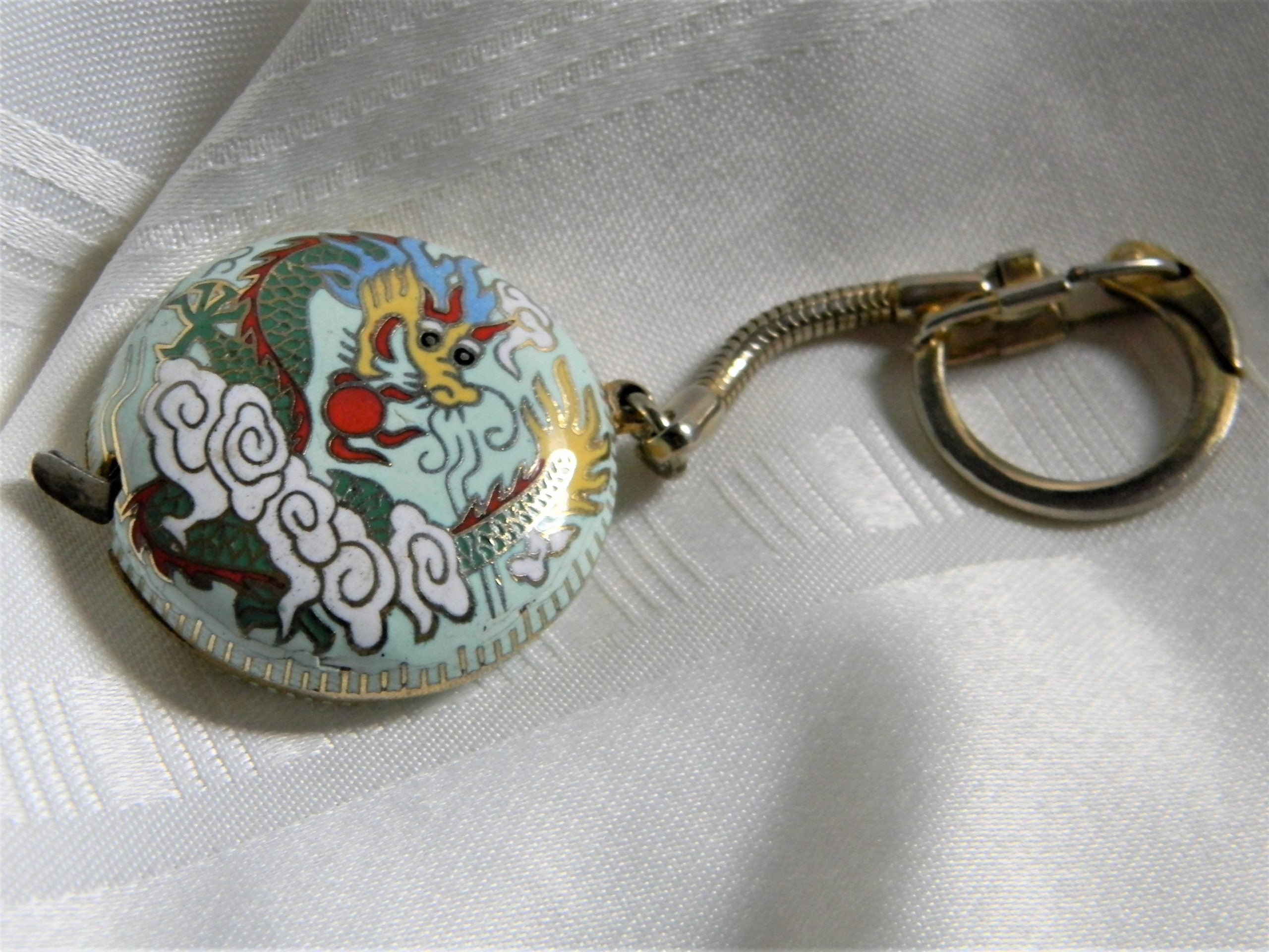 h654 Great Vintage Round Enamel Dragon Tape Measure on Gold Tone Key Chain