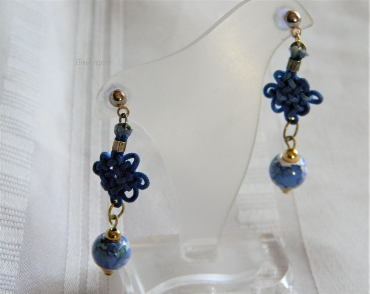 h994 Beautiful Gold Tone Dangle Earrings with Blue Knots and Ceramic Beads