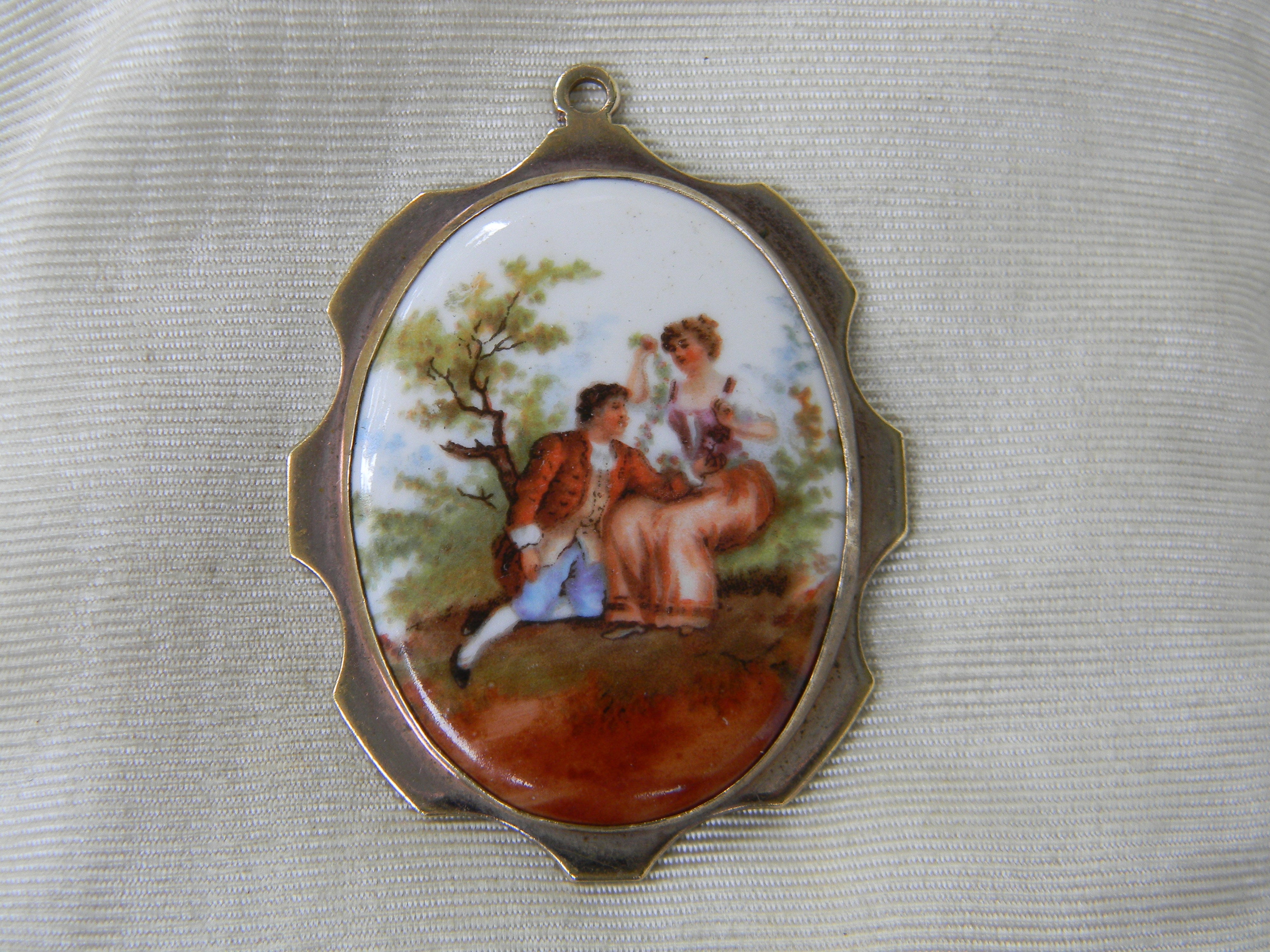 j958 Vintage Large Gold tone Porcelain Printed Pendant