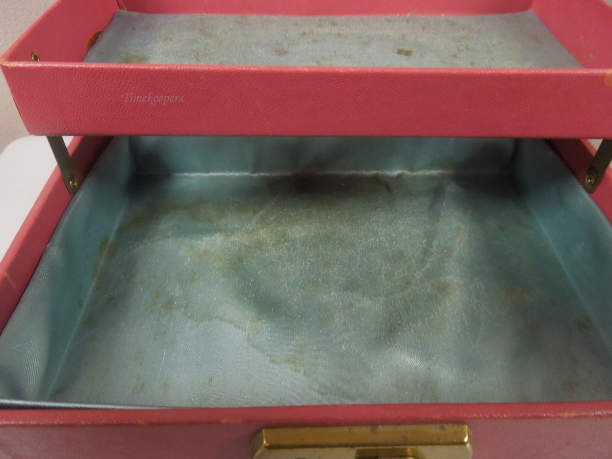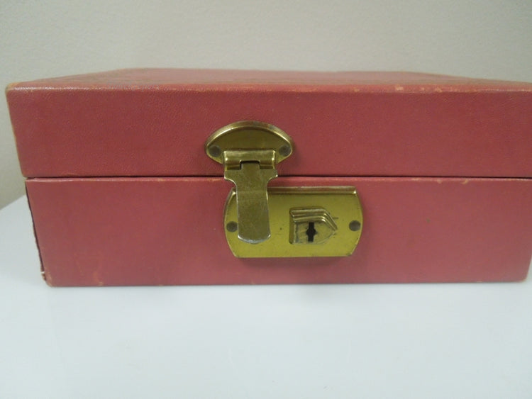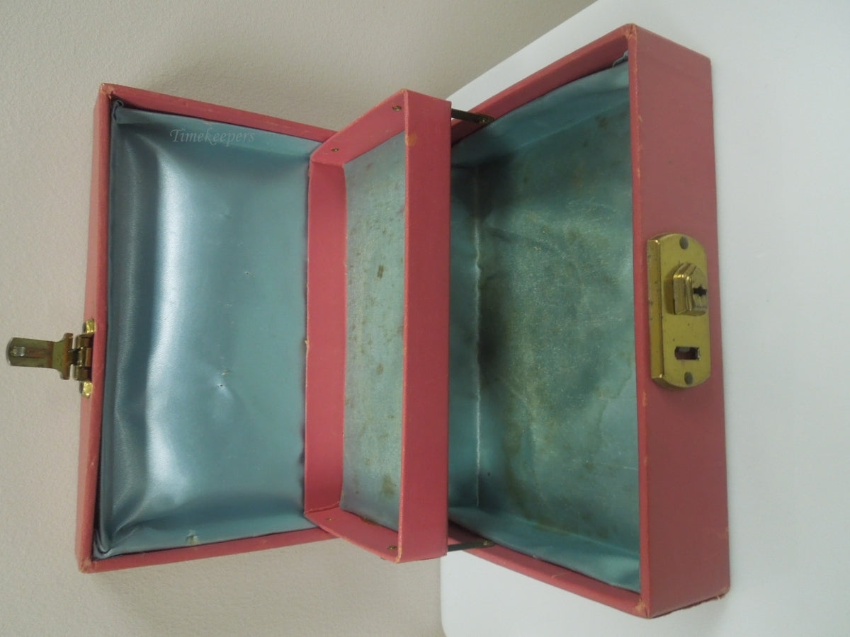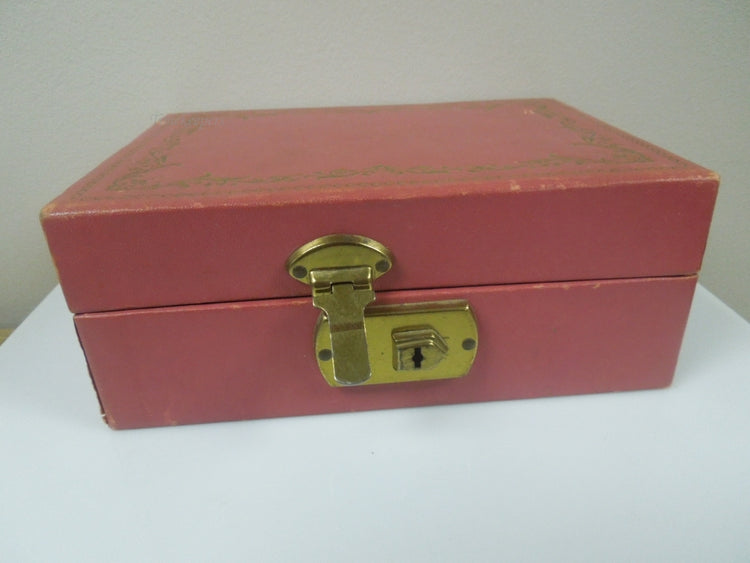 This is a pretty vintage cloth jewelry box. It's in shades of Red or Pink. There is no key that goes with this jewelry box.