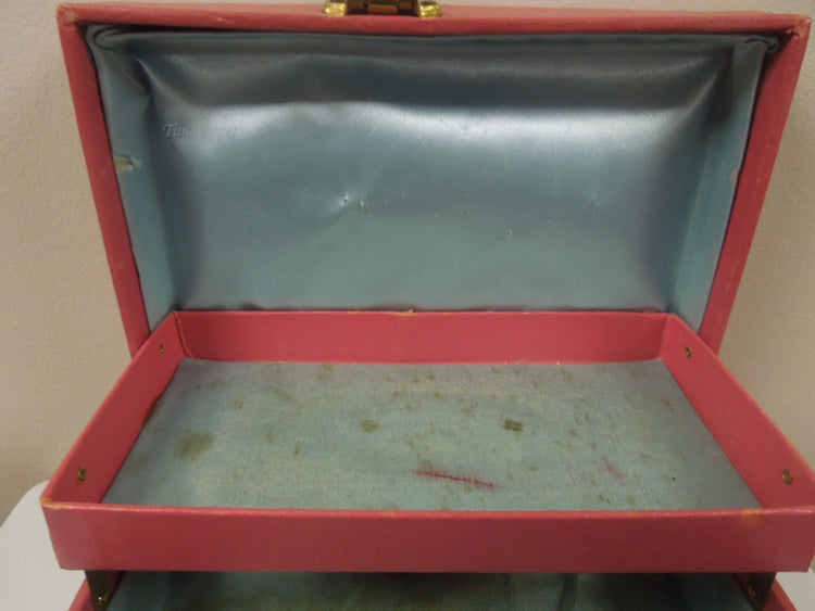For Sale: (1) q811 Vintage Jewelry Box Fleur de Lis Red Satin Interior Mirror Faux Leather