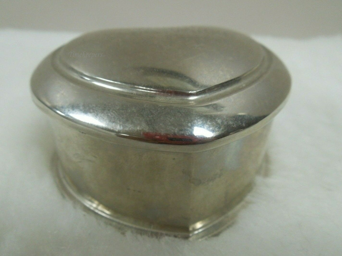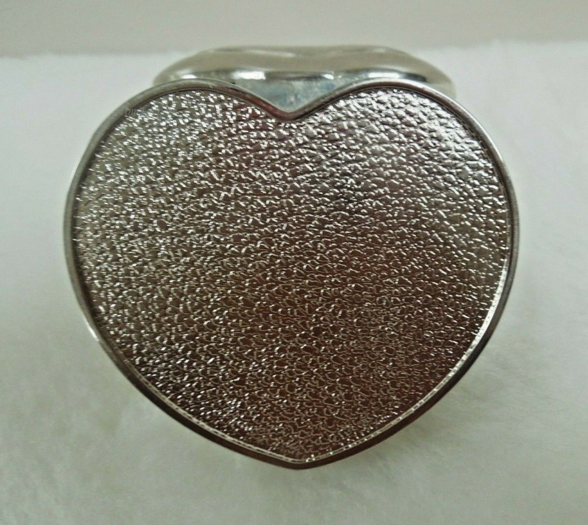 This is a gorgeous vintage silver tone metal heart shaped jewelry or trinket box. It is made of heavy metal. The lid is not removable, and it is fixed. There is a dark blue cloth lining the inside. It is clean and intact. The box is approx. 3.5" x 3.5" x 2" tall. It has minor surface scratching and wear. Very nice condition.