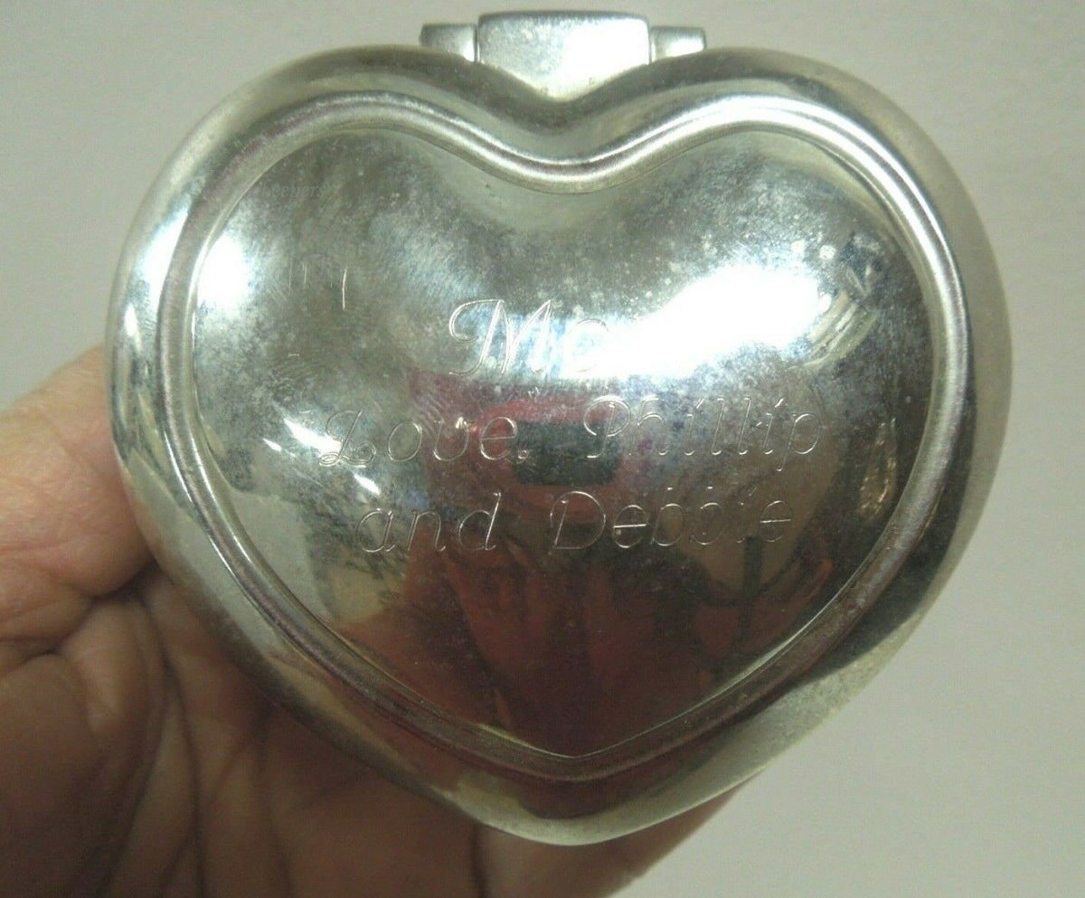 q860 Vintage Metal Jewelry Trinket Heart Box Dark Blue Velvet Lining Silver Tone Engraved Name