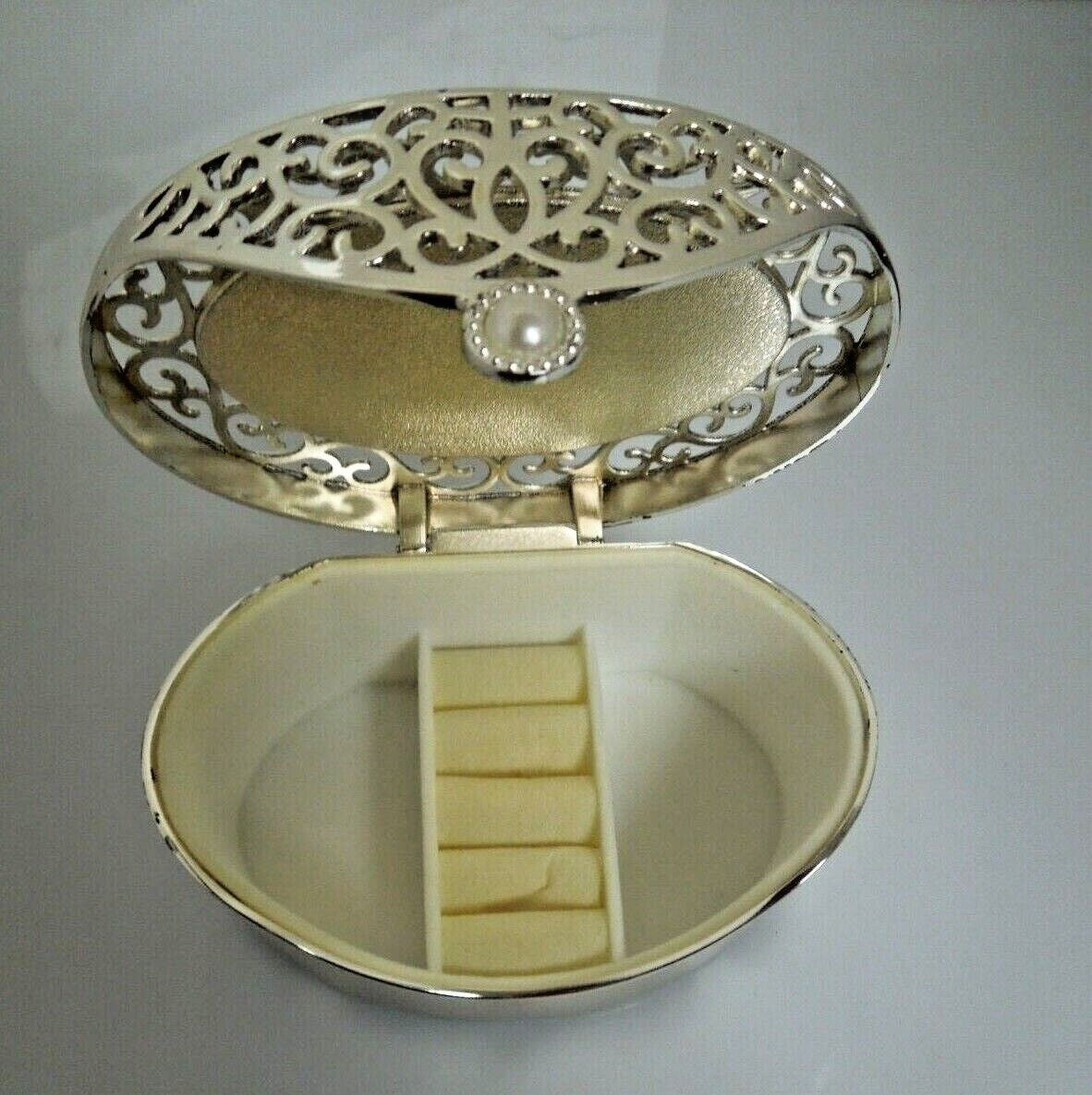This beautiful silver keepsake box features filigree details, a pearl closure and an ivory colored velvet interior. It's the perfect place for her to store her most treasured pieces of jewelry.