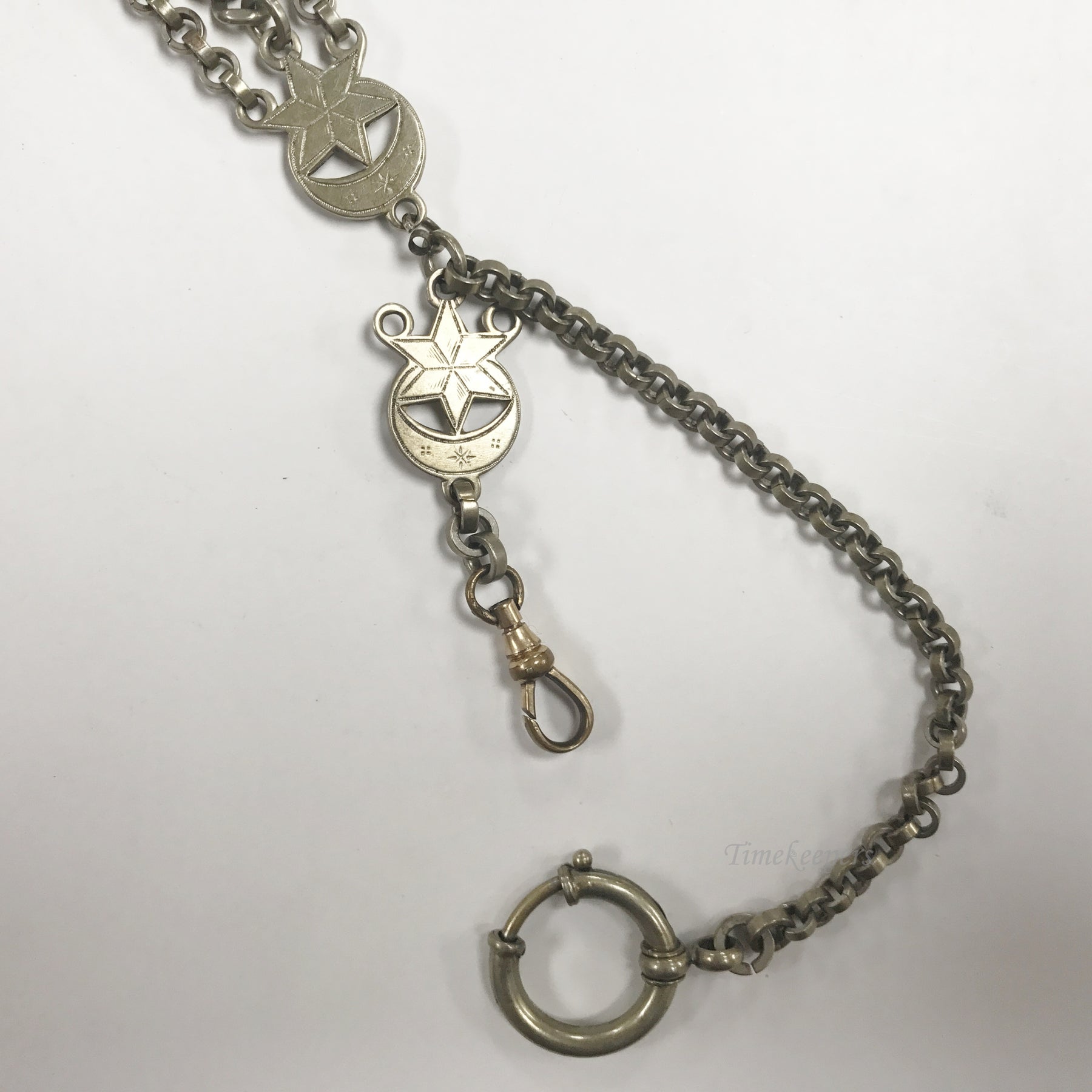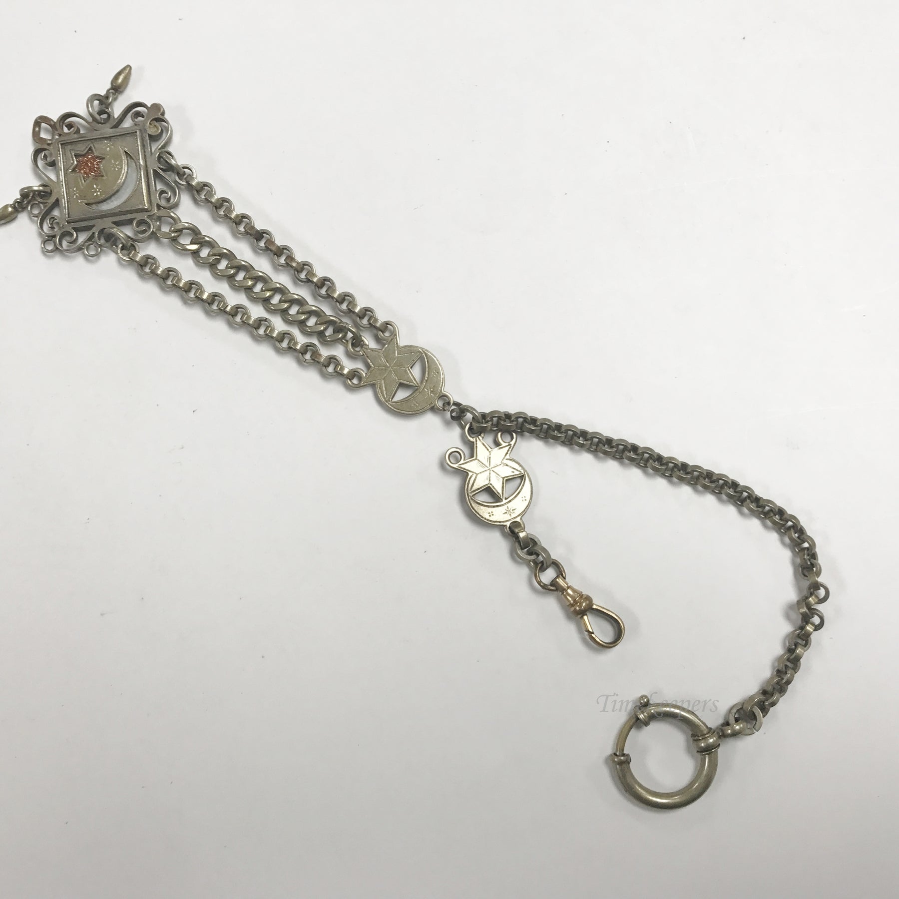 - Antique Pocket Watch Vest Chain. Gold Filled Silver Tone. Round clip with 5" long chain with 2 attachments. Small star medallion with pocket watch chain and spring clasp approx 2" long. Second attachment small star medallion on one end, connected bu 3 2/5" long chains to a large filigree star medallion. Small medallions are approx. .75' x .5"; large medallion approx 1.5" x 1.5".