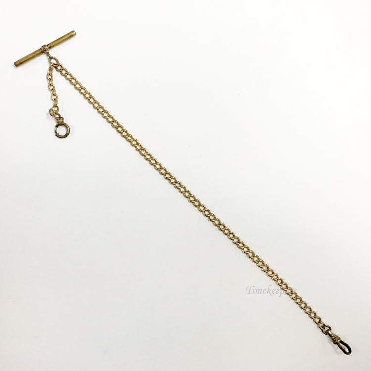 - Antique Pocket Watch Vest Chain. Gold Filled Gold Tone. Button bar, spring clasp, wide oval links.