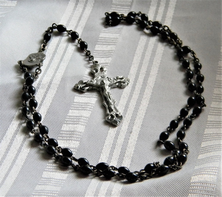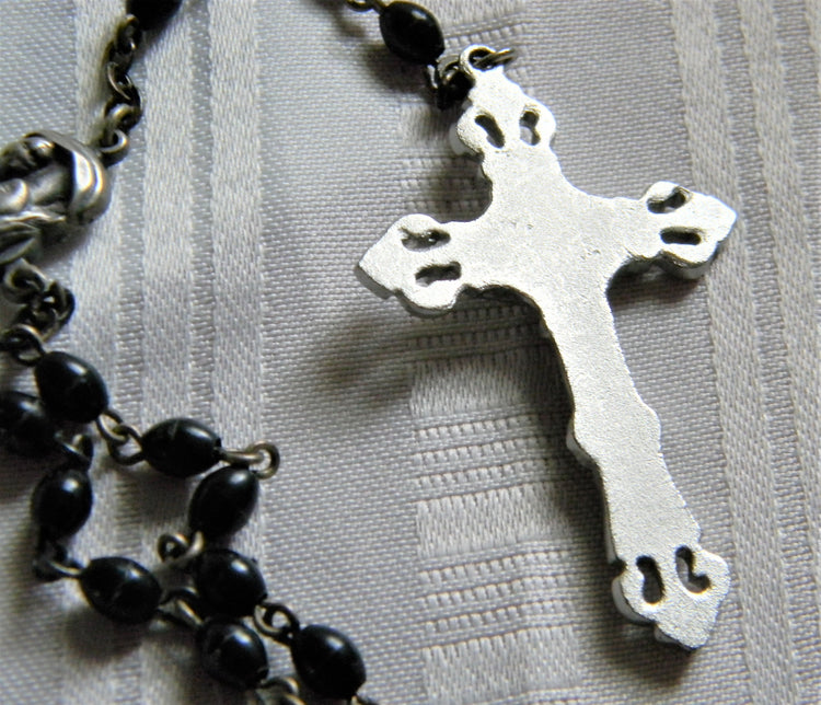 This is a beautiful metal black metal beaded rosary with silver tone cross and Virgin Mother.