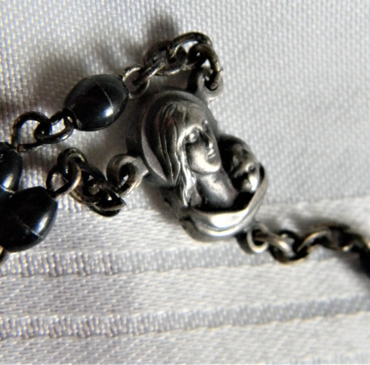 For Sale: (1) Vintage Rosary with Black Metal Beads Cross Virgin Mother in Silver tone