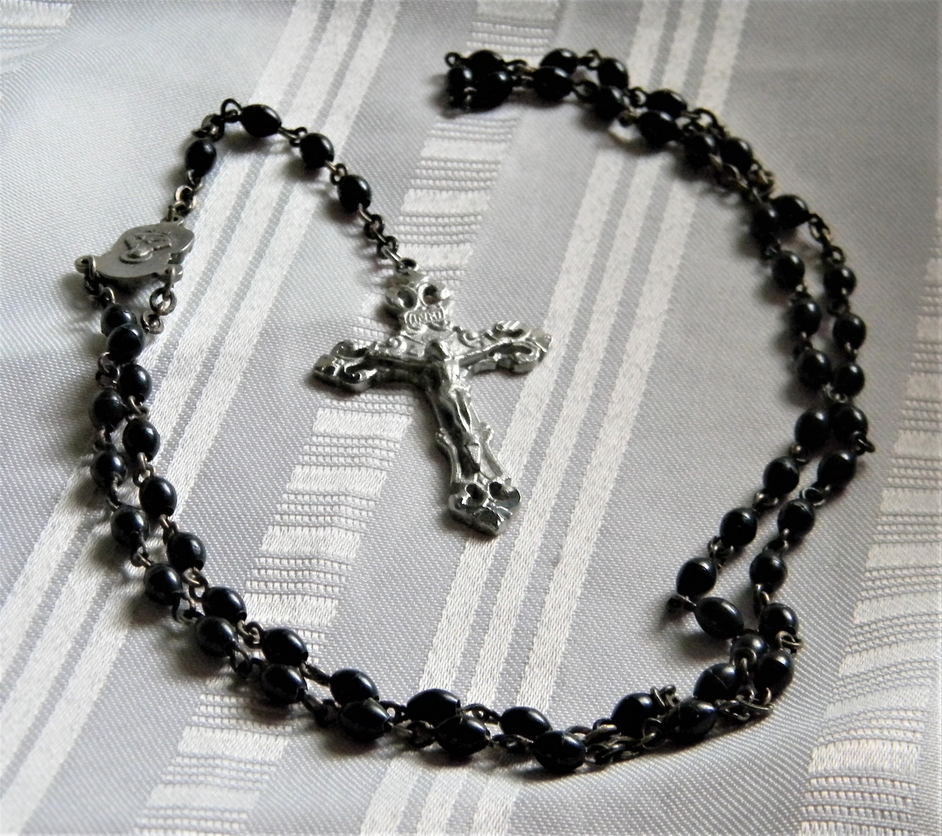h881 Vintage Rosary with Black Metal Beads Cross Virgin Mother in Silver tone