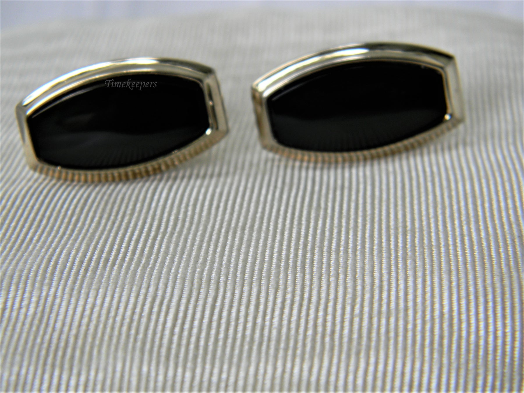 Preowned pair of cuff links. These cuff links feature a black stone on gold tone cufflinks. These are marked Shields. They still look great for their age. A handsome and timeless pair.