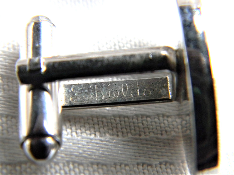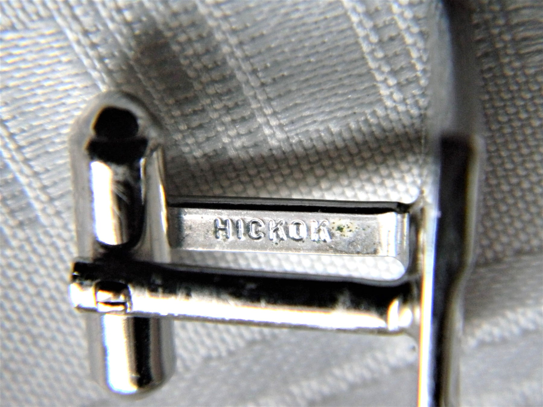 Lot of (4) cuff links for sale. Oval silver tone with a "D" are marked Shields. Gold Tone Acorn cuff links are unmarked. Hickok are silver tone with a geometric design. Square gold tone with ridged finish are unmarked.