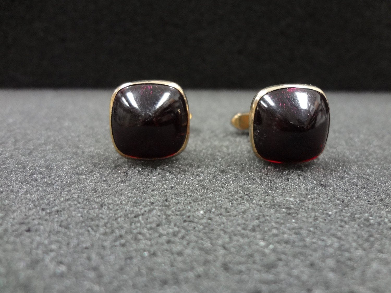 Vintage pair of cuff links featuring a truncated dark red stone. These cuff links have an art deco design by Swank. They still look great for their age.