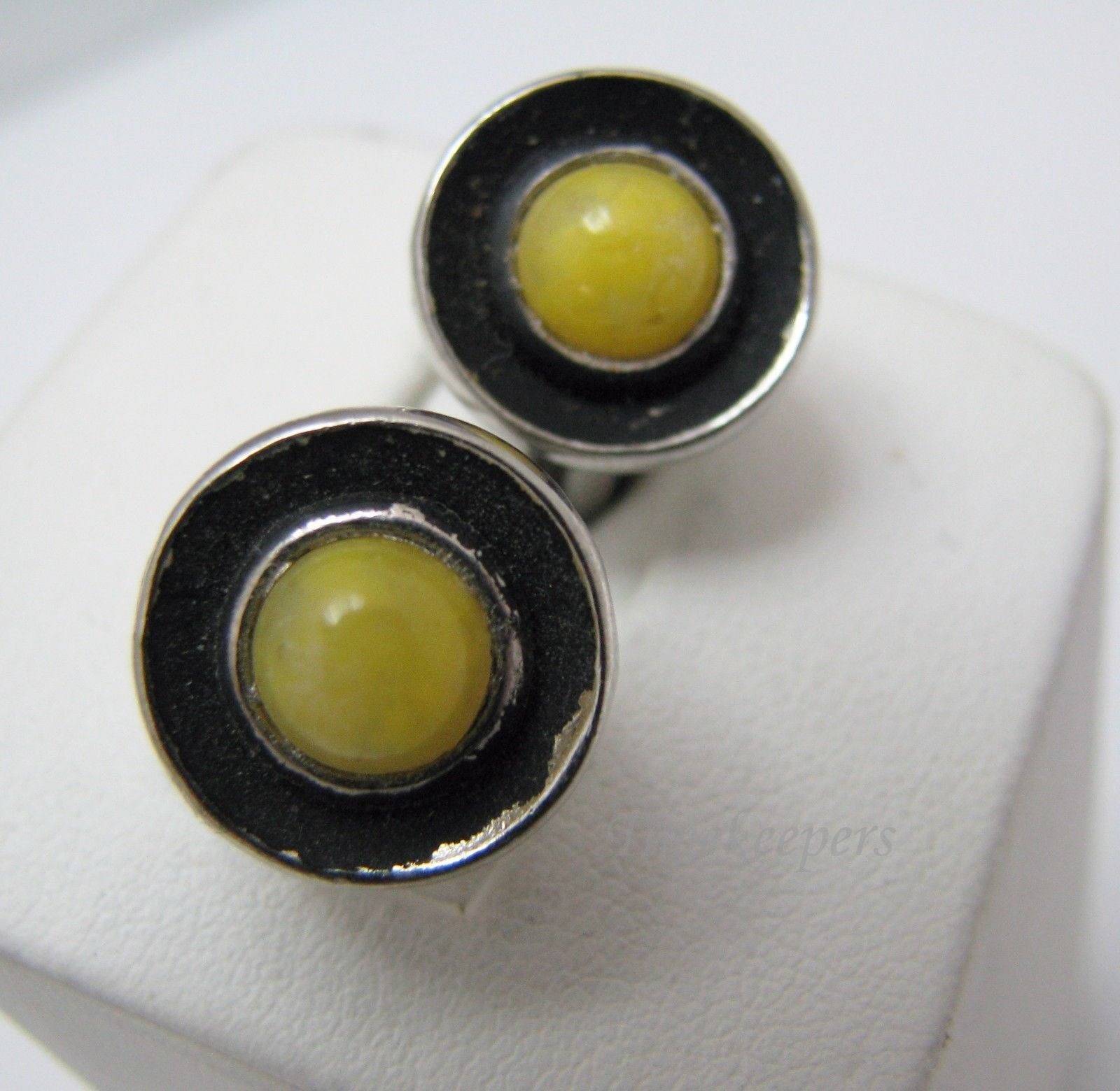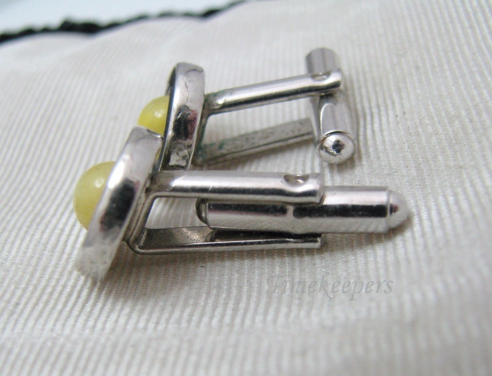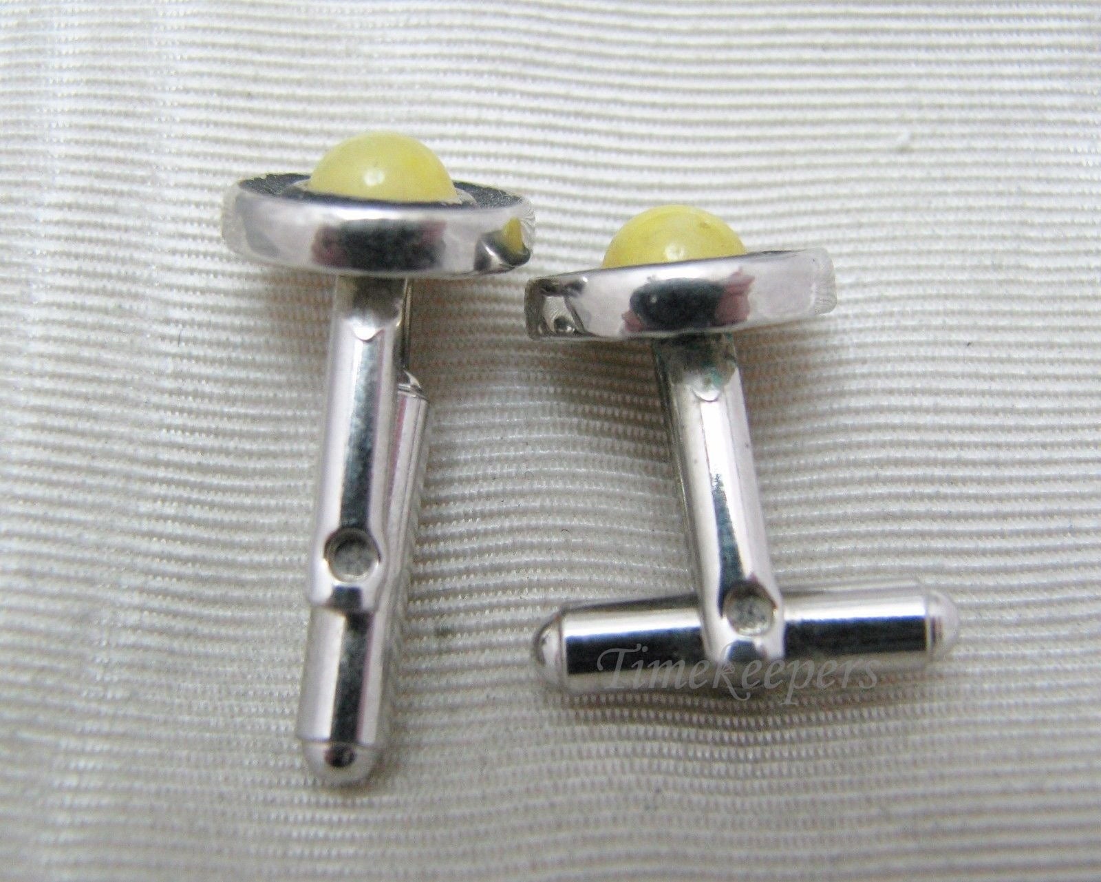 Vintage pair of small round cuff links with a center yellow stone framed with a black rim in a silver tone finish. They still look great for their age.