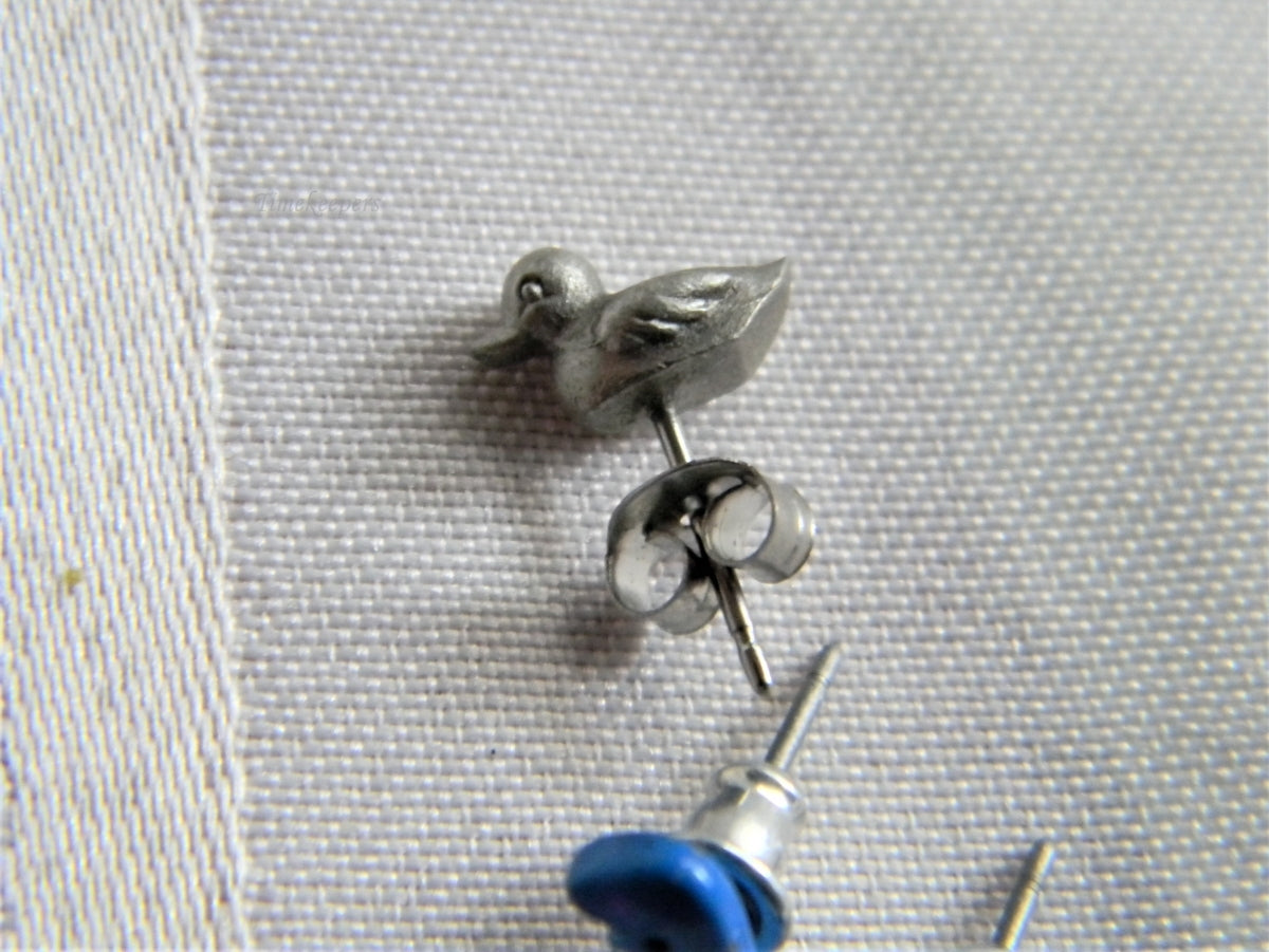 Offered here is four pair of silver tone earrings. Three are little enamel dinosaurs. One pair are little ducks sitting in a bathtub. They all have push backs. There are no markings on these earrings.