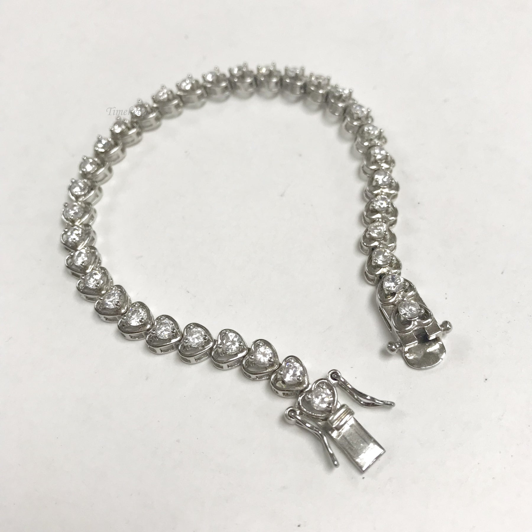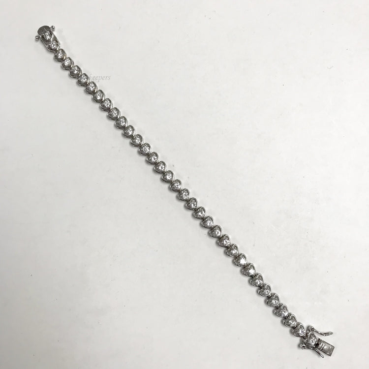 - 6.5" long vintage bracelet, Sterling Silver Hardware. Heart shaped links with white round stone in each 2mm in diameter. 34 stones total