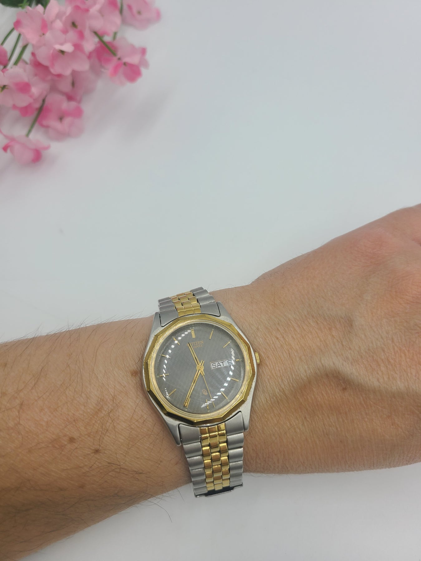 This is a nice, simple two-tone Citizen quartz wristwatch. Unisex and perfect for everyday wear. Day and date feature at the 3 o'clock position. Would be a nice anniversary, birthday, Christmas,Father's Day, Mother's Day or Valentine's Day gift for him or her.