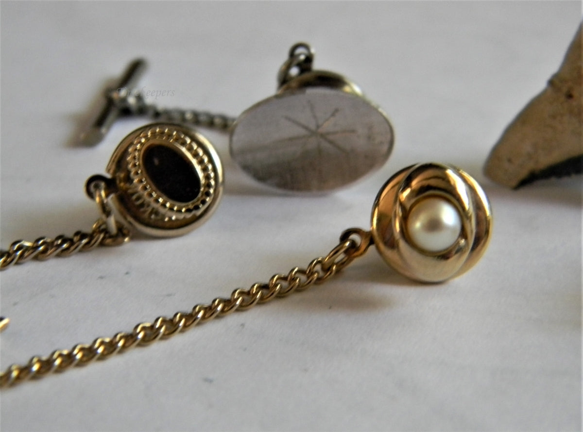 Oval gold tone Swank tie tack with center pearl, approx. 6 mm x 10 mm. Pearl is approx. 3 mm.