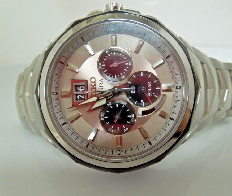 The Seiko Coutura Stainless Steel Silver Dial Men's Chronograph Solar Watch features a stainless steel 45mm case, with a fixed bezel, a silver dial and a scratch resistant sapphire crystal.
