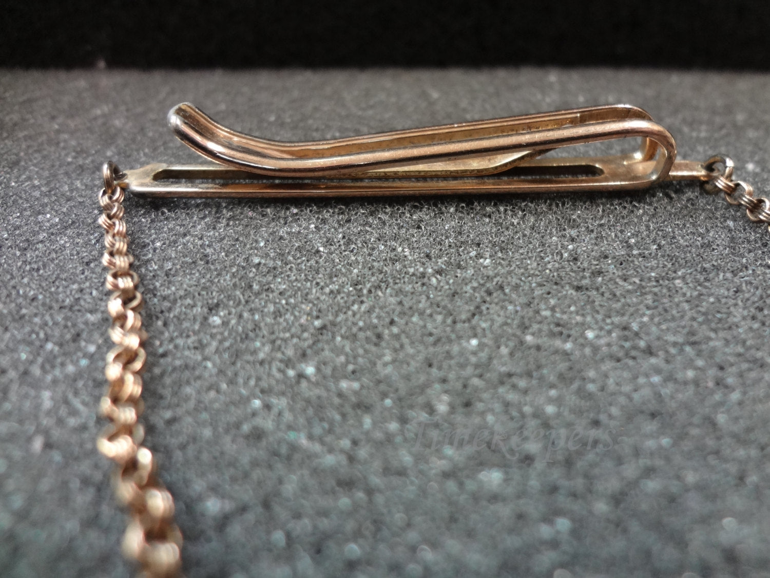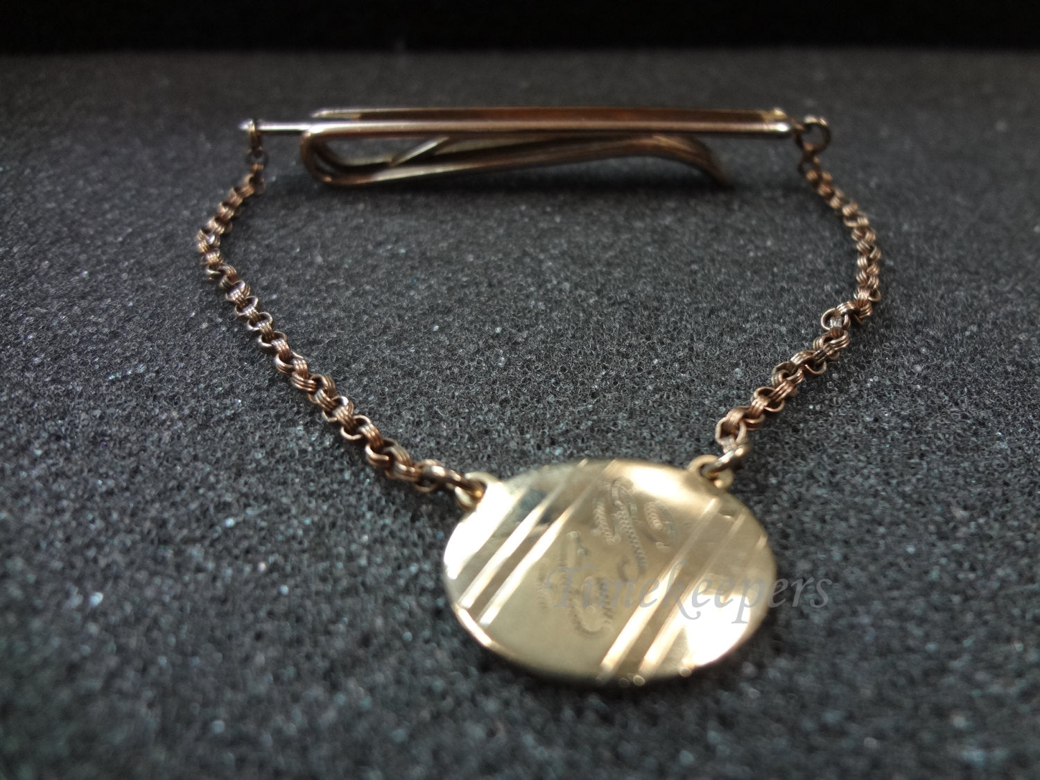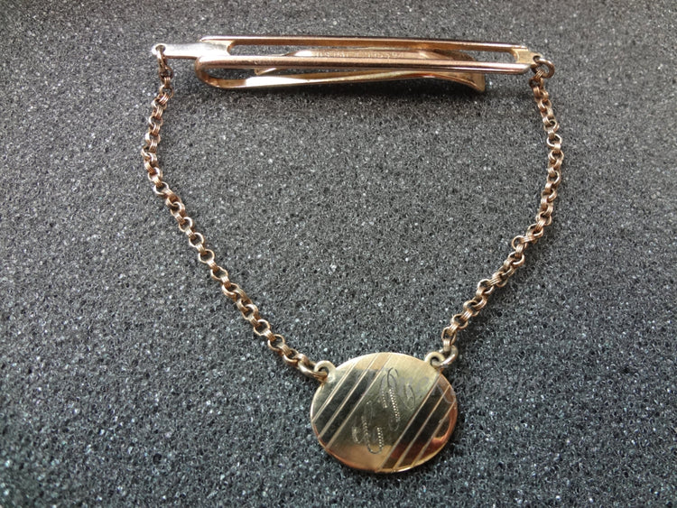 b009 Vintage Tie Bar with Chain and Small Engraved Medallion
