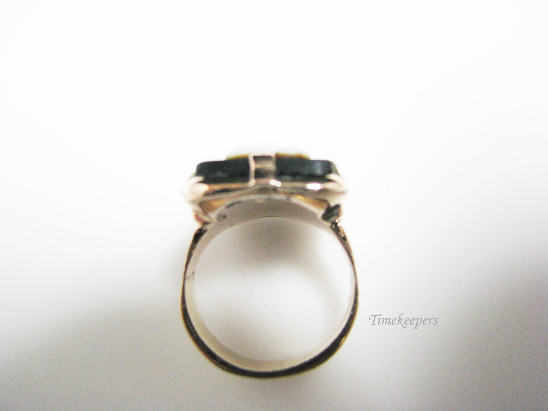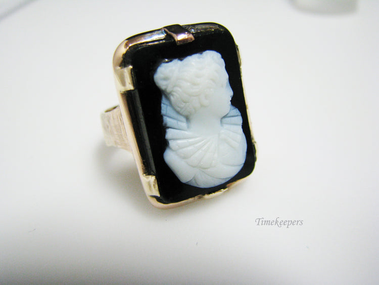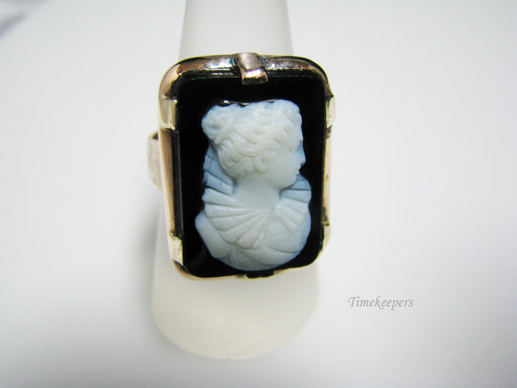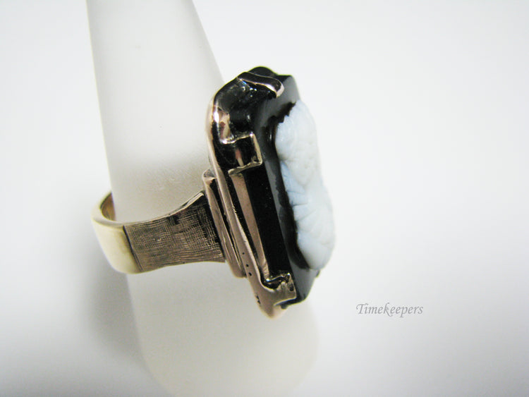 Top of ring features an onyx background with carved white lady on top. Ring is not marked but has been tested to 10k gold.