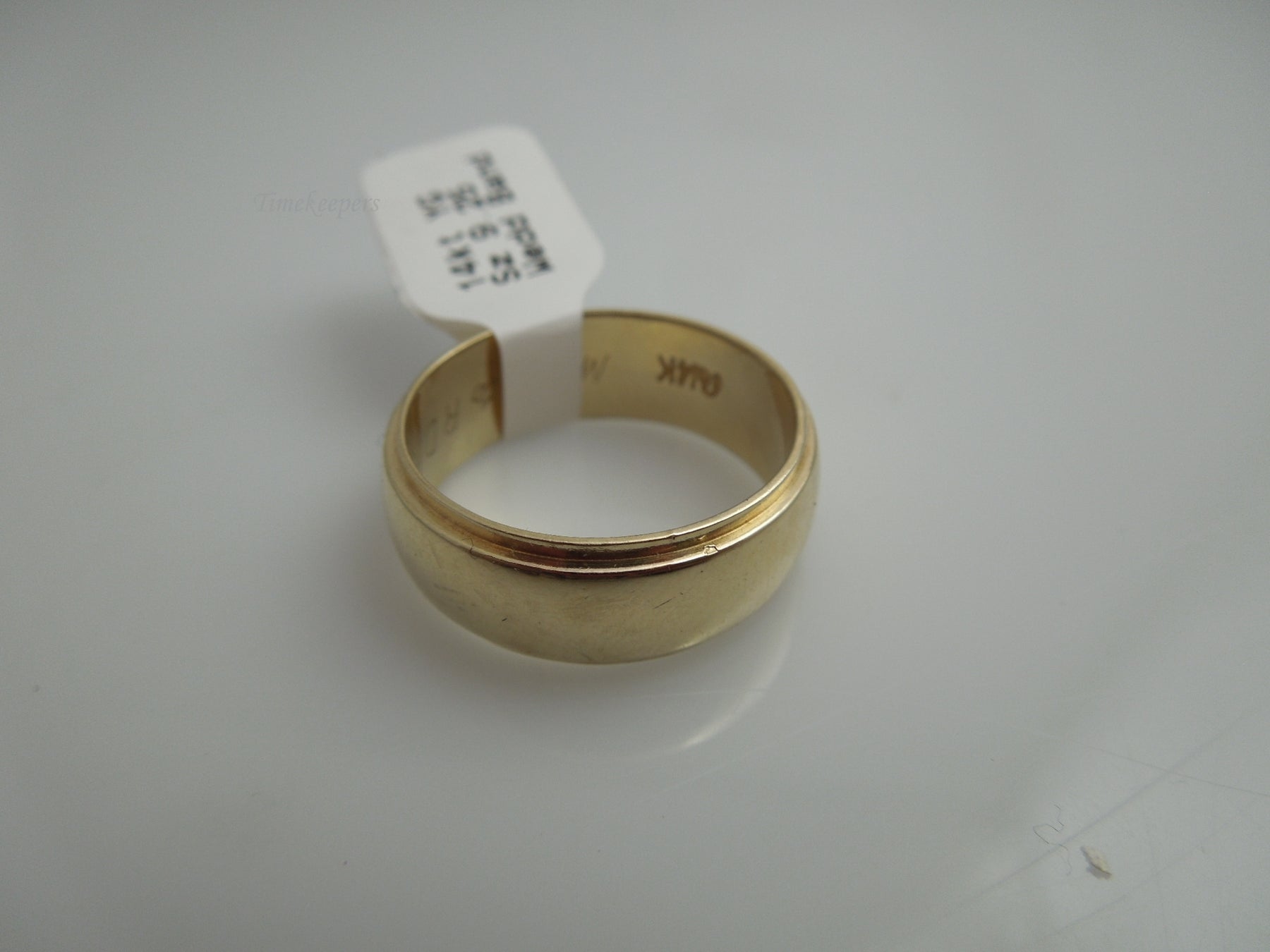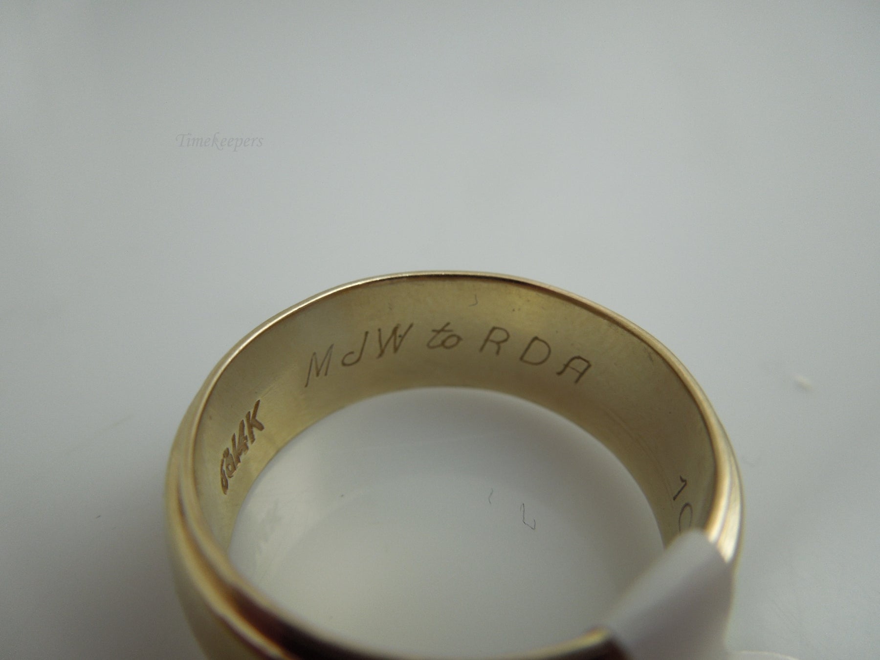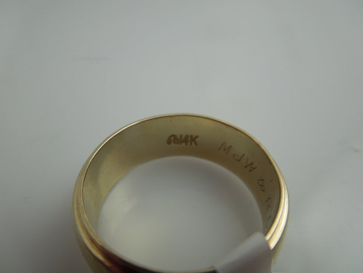This is a nice, wide wedding band for him or her. Inside of ring does have an engraving saying "MJW to RDA 10-2-60". Perfect for daily wear. Shank is stamped 14k.