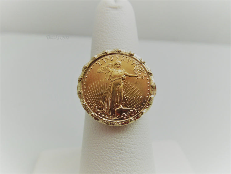 This is a nice 14kt yellow gold Liberty coin ring. It features a 1999 $5 1/10th fine gold US Liberty gold coin, nestled into this woodgrain style setting. Perfect for daily wear. Shank is stamped 585. Would be a nice anniversary, birthday, Christmas, Father's Day, Mother's Day or Valentine's Day gift for him or her.
