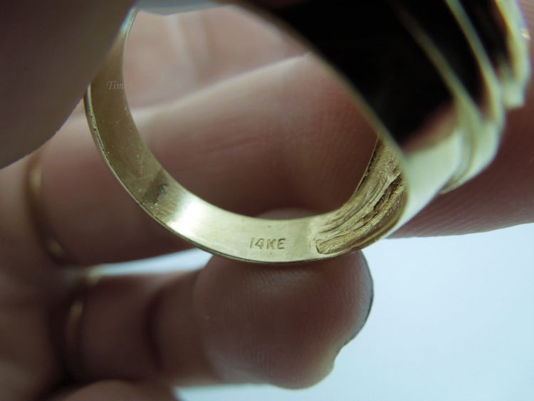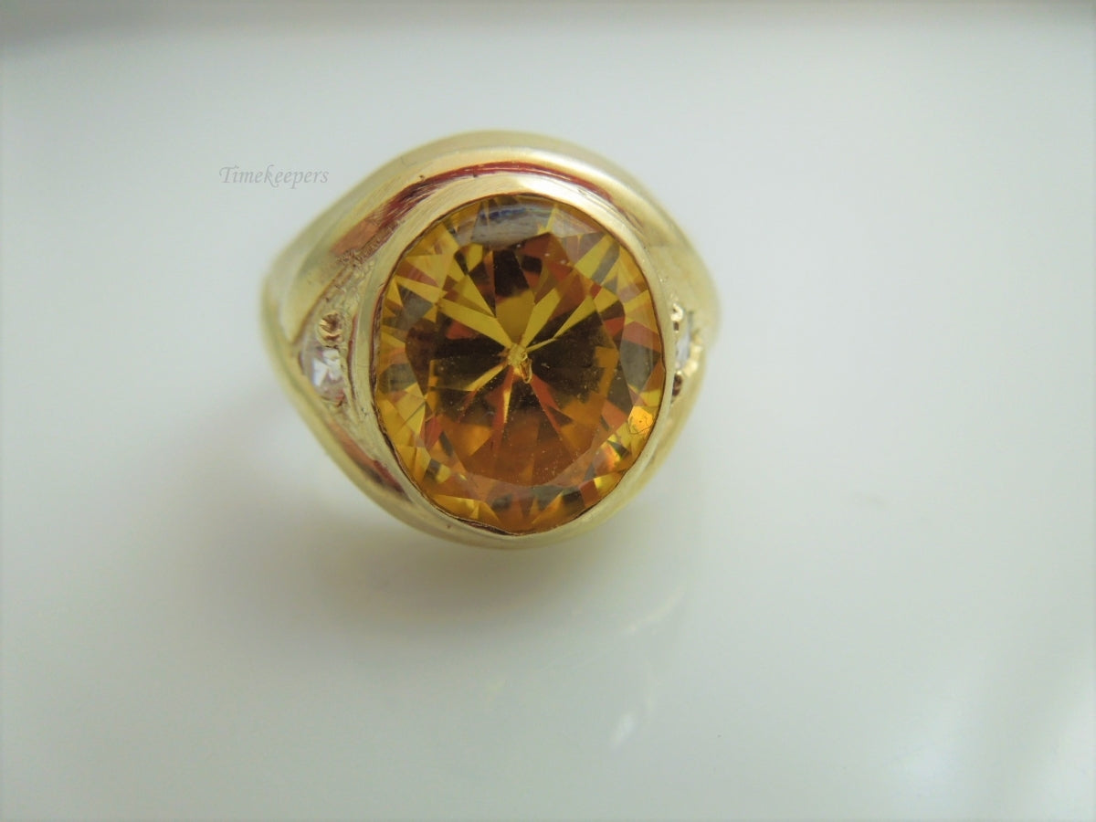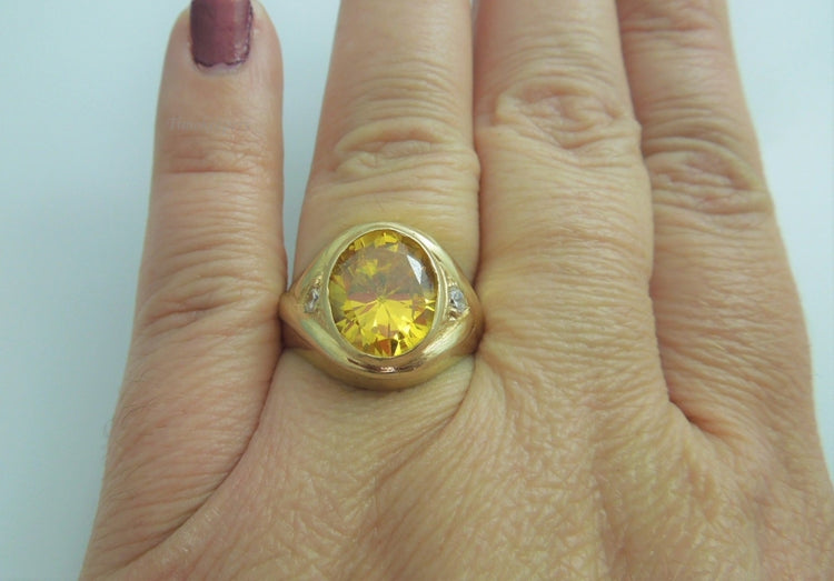 This is a nice 14kt yellow gold ring. Unisex. It features a large oval lab created yellow topaz stone, with a round cubic zirconia stones on each side. Shank is stamped 14k. Would be a nice anniversary, birthday, Christmas, Father's Day, Mother's Day or Valentine's Day gift for him or her.