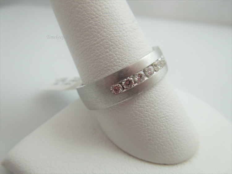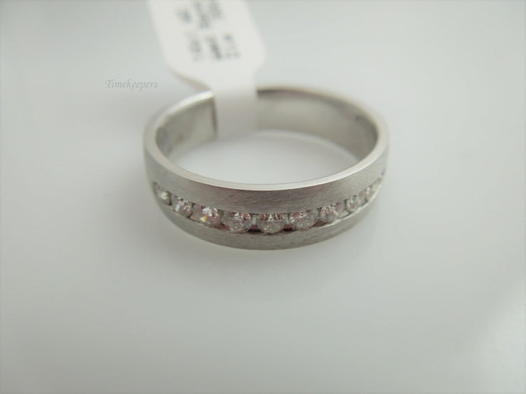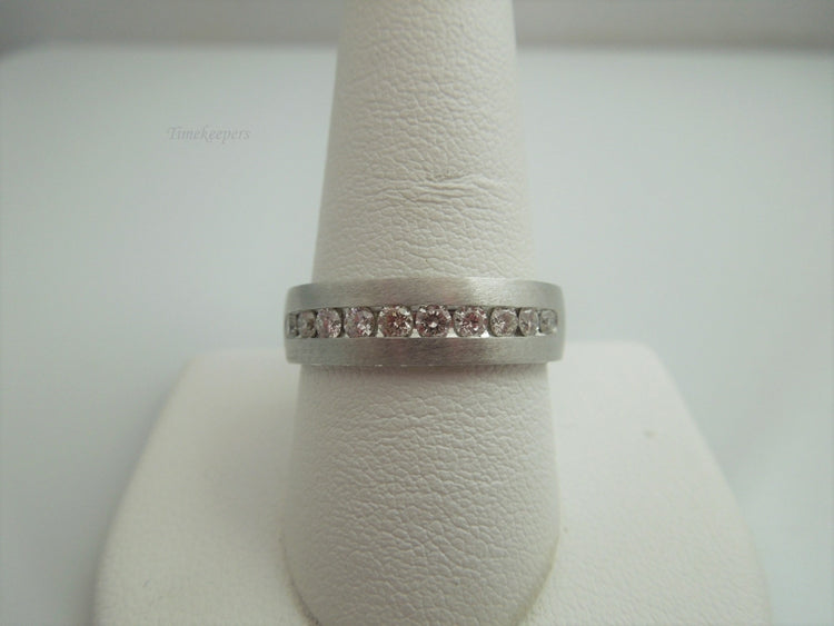 This is a nice, unisex 14kt brushed white gold diamond wedding band. It features (10) ten .05ct diamonds set in a row along the top of the band. Inside shank is stamped 14k. Would be a nice wedding band for him or her.