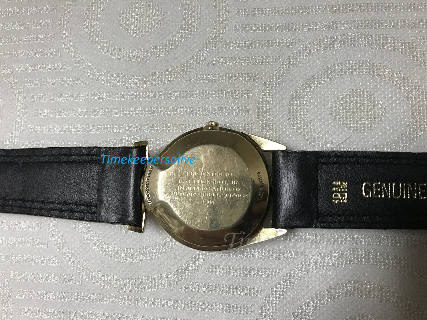 •Back panel reads: "14k gold"; "Hamilton"; engraved "Presented to E.G.Buckshot, Jr. in appreciation of 25 years shell service 1964"