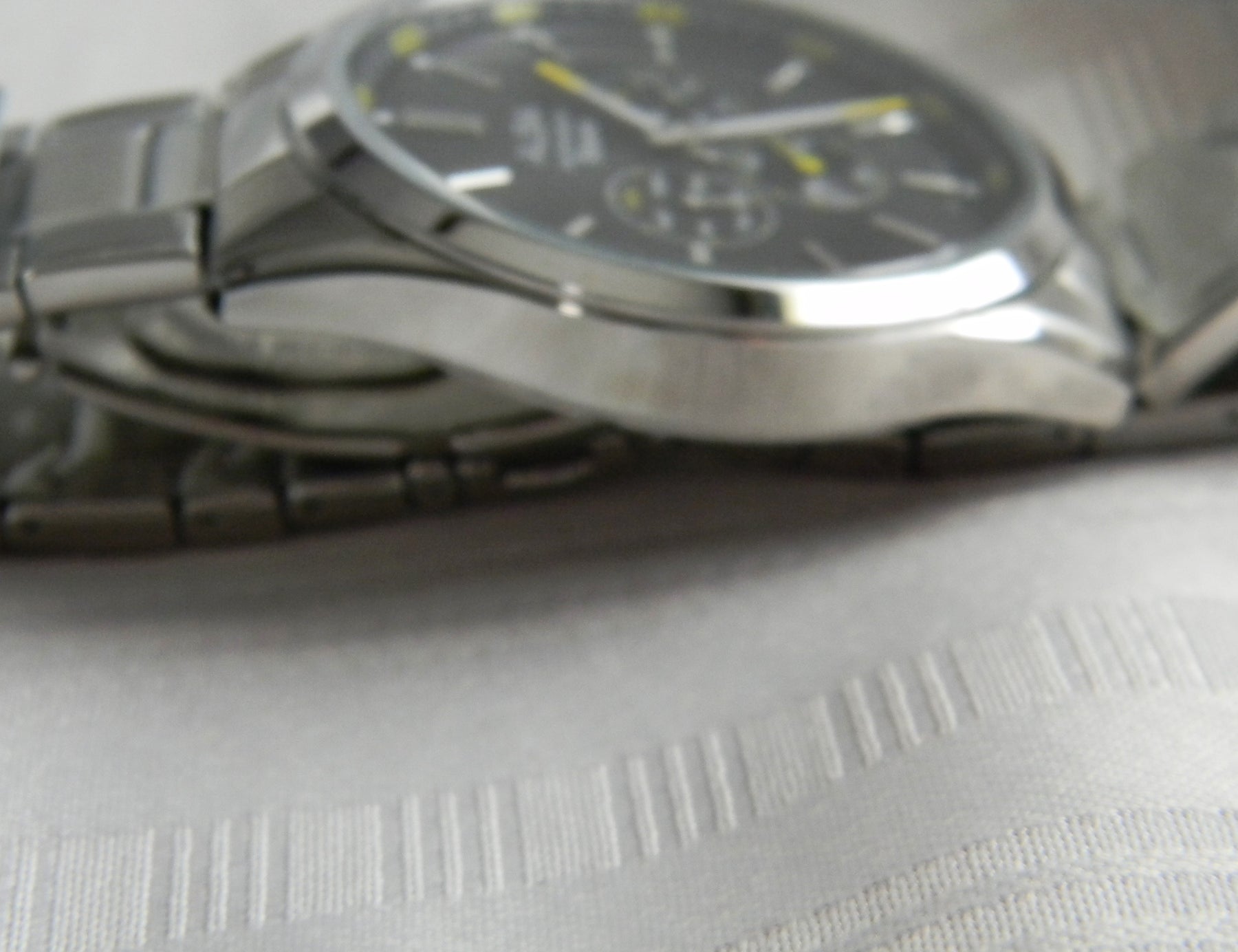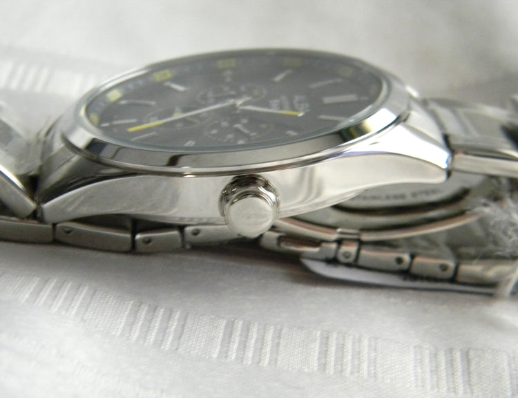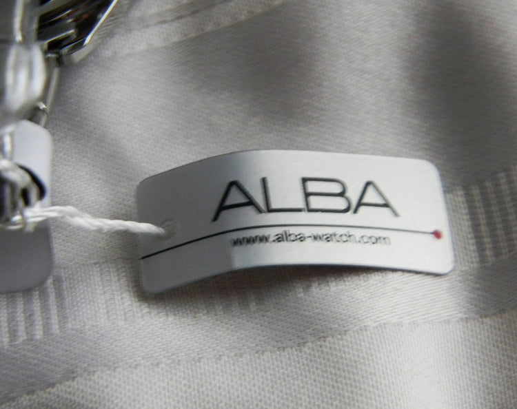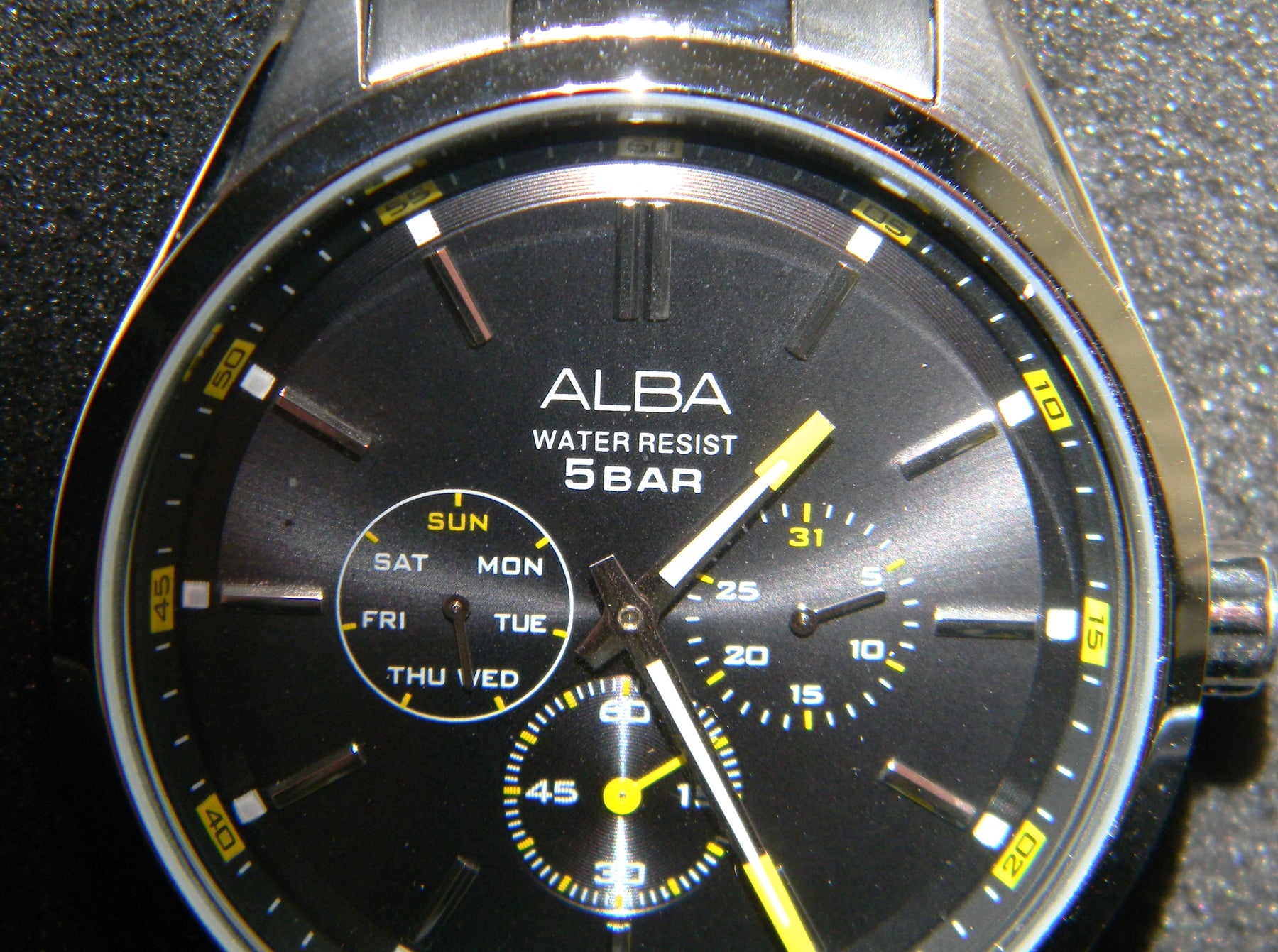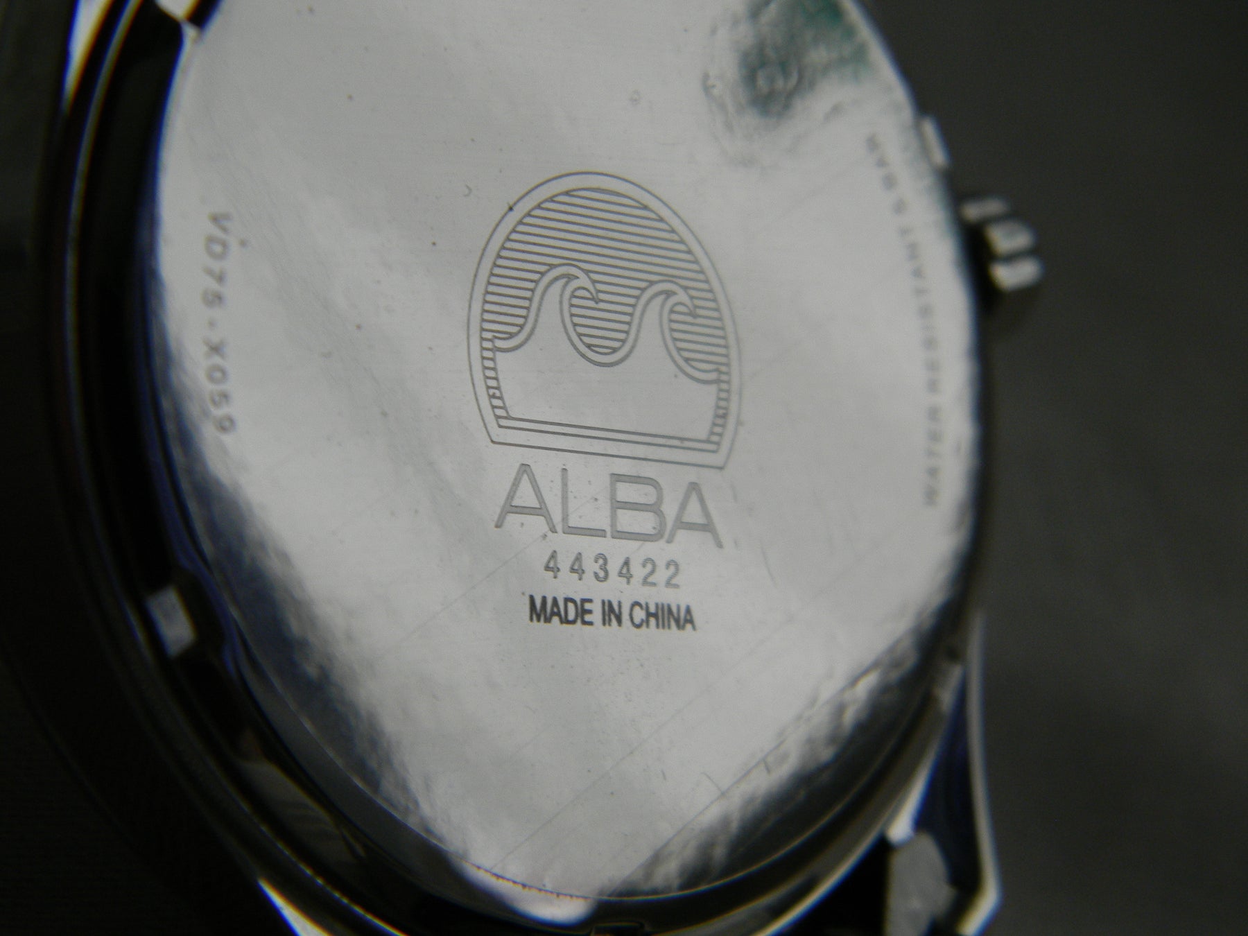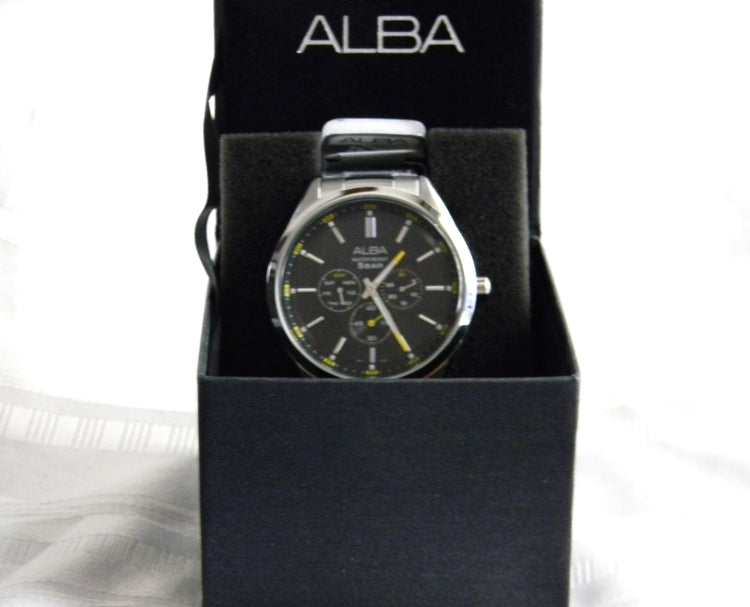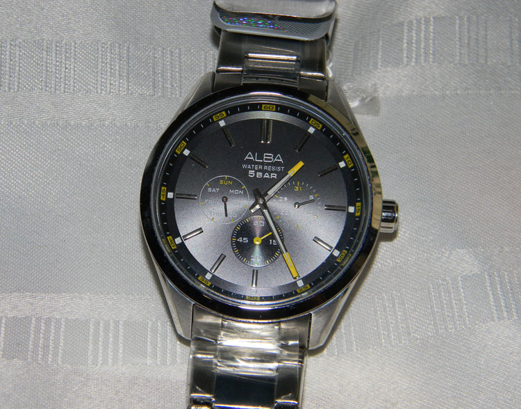 This is an Alba quartz watch by Seiko. The watch features a bracelet band with a folding closure. The dial is black with 3 dials, date seconds and day.The dials says ALBA Water resistant, 5 Bar. The back of the watch is stamped ALBA, 443422, MADE IN CHINA, VD75-X059 and St. Steel.