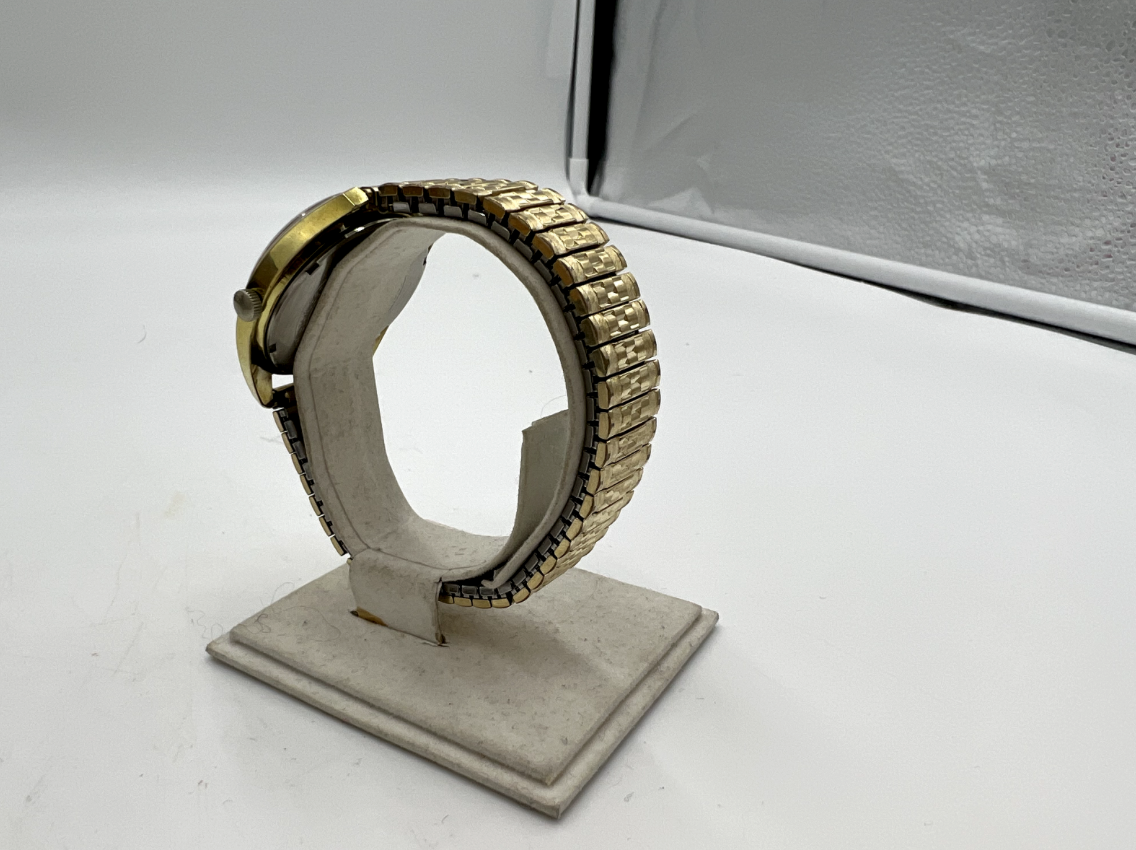 32mm dial, 2cm width of band. 10k gold filled, stainless steel back. Stretch band. 2.5 ounces.