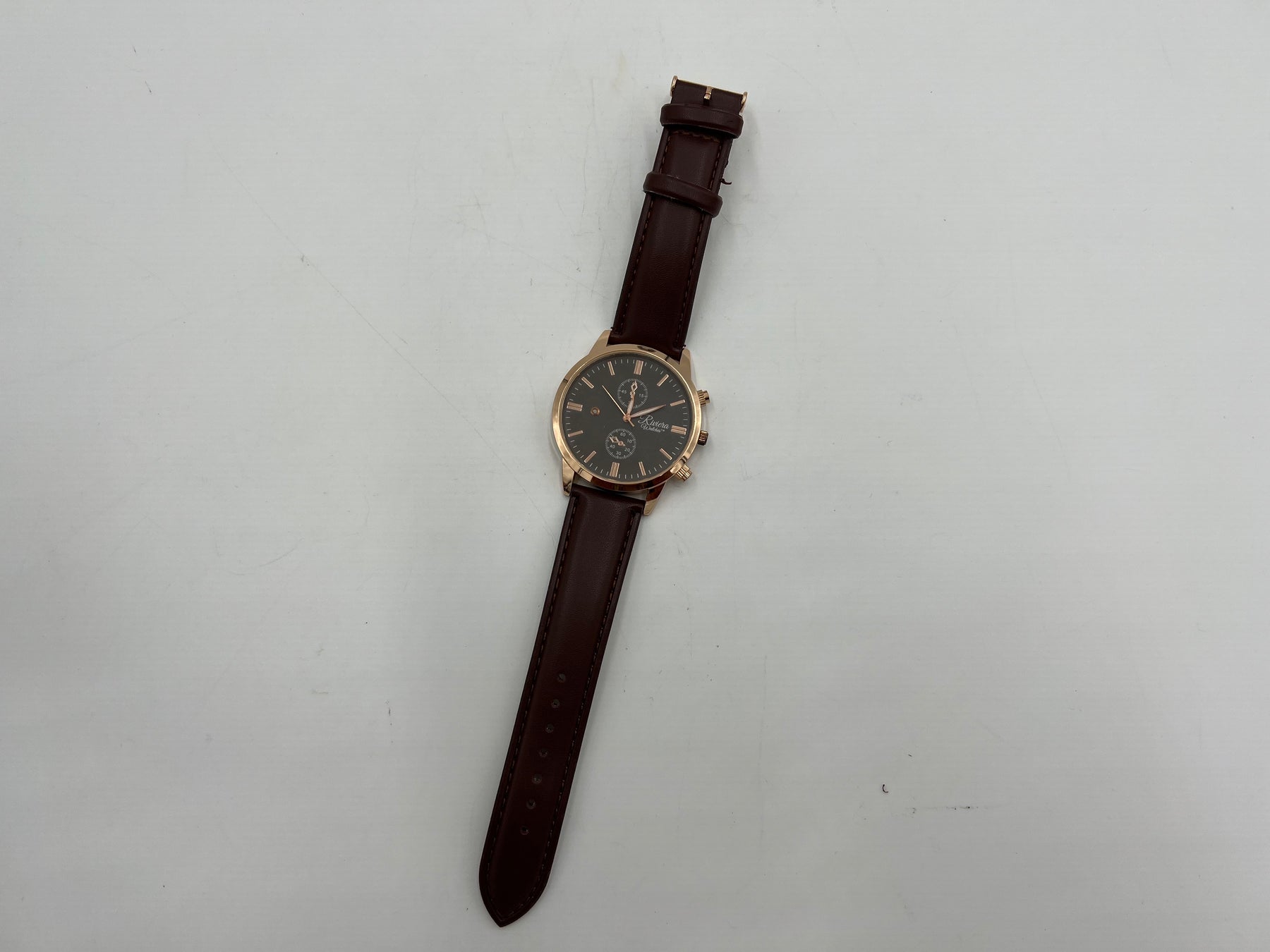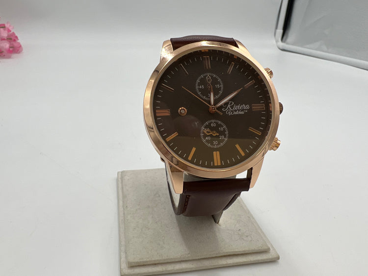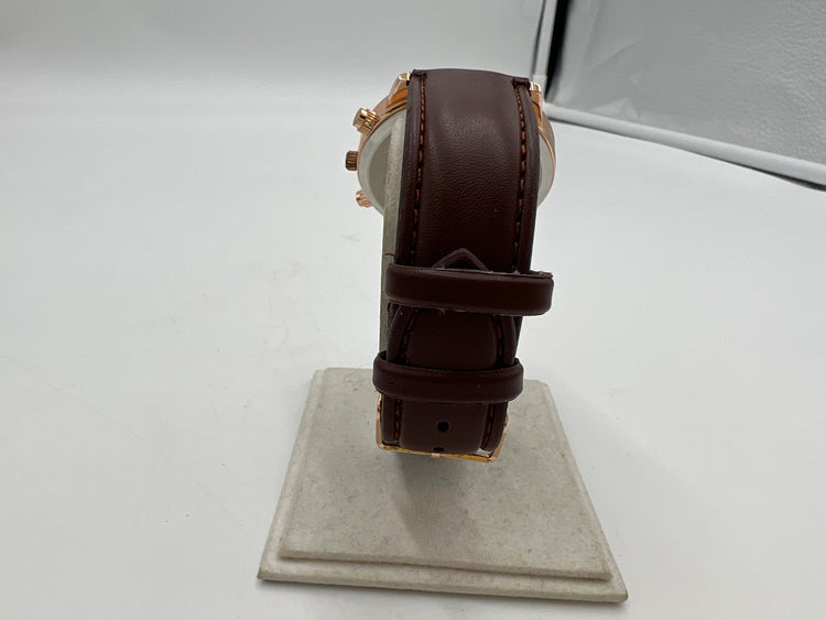 Unisex Watch, gold toned and brown dial, stainless steel back. Genuine leather brown band.