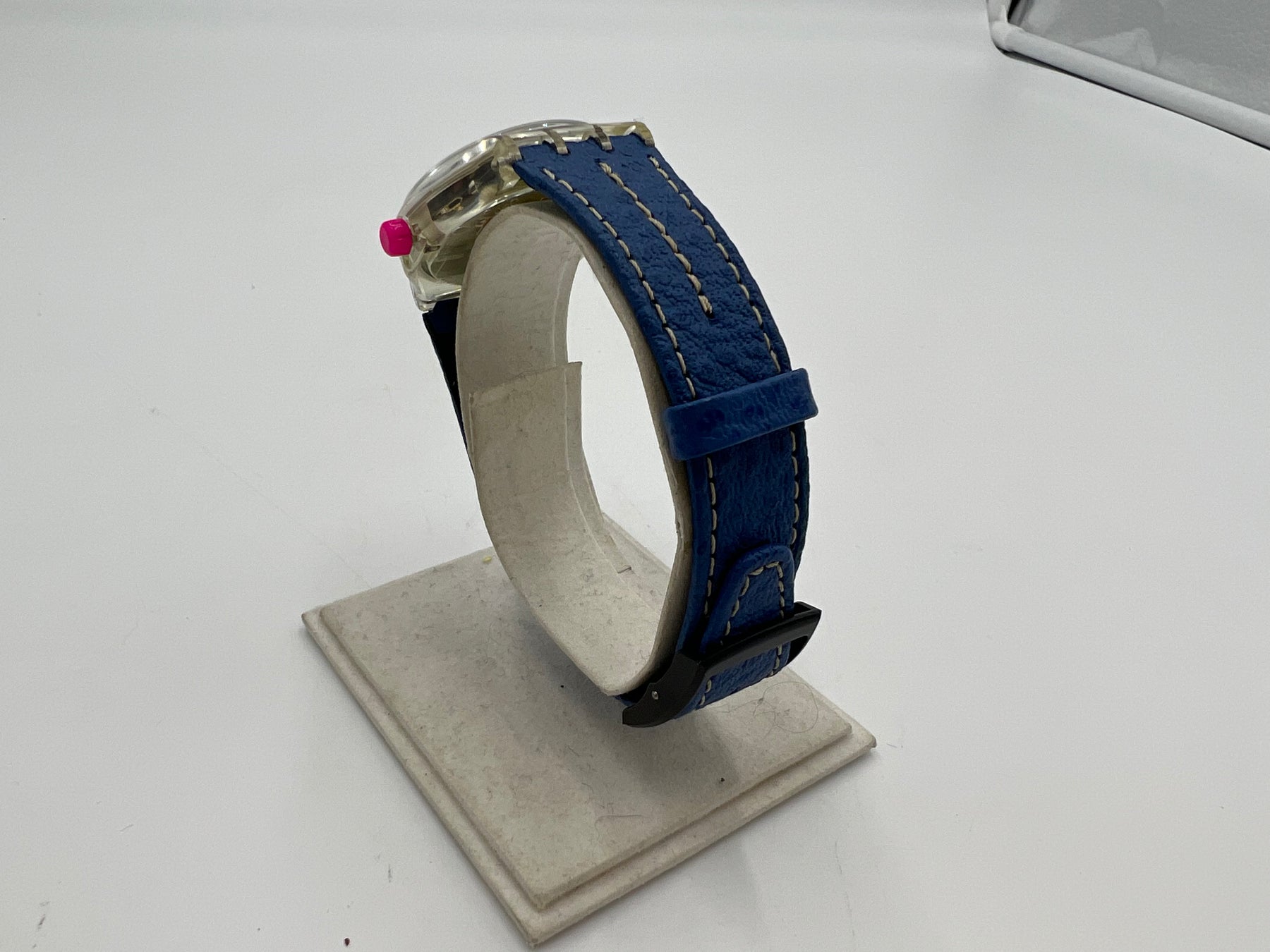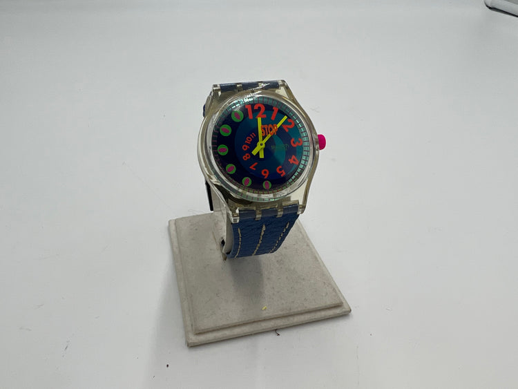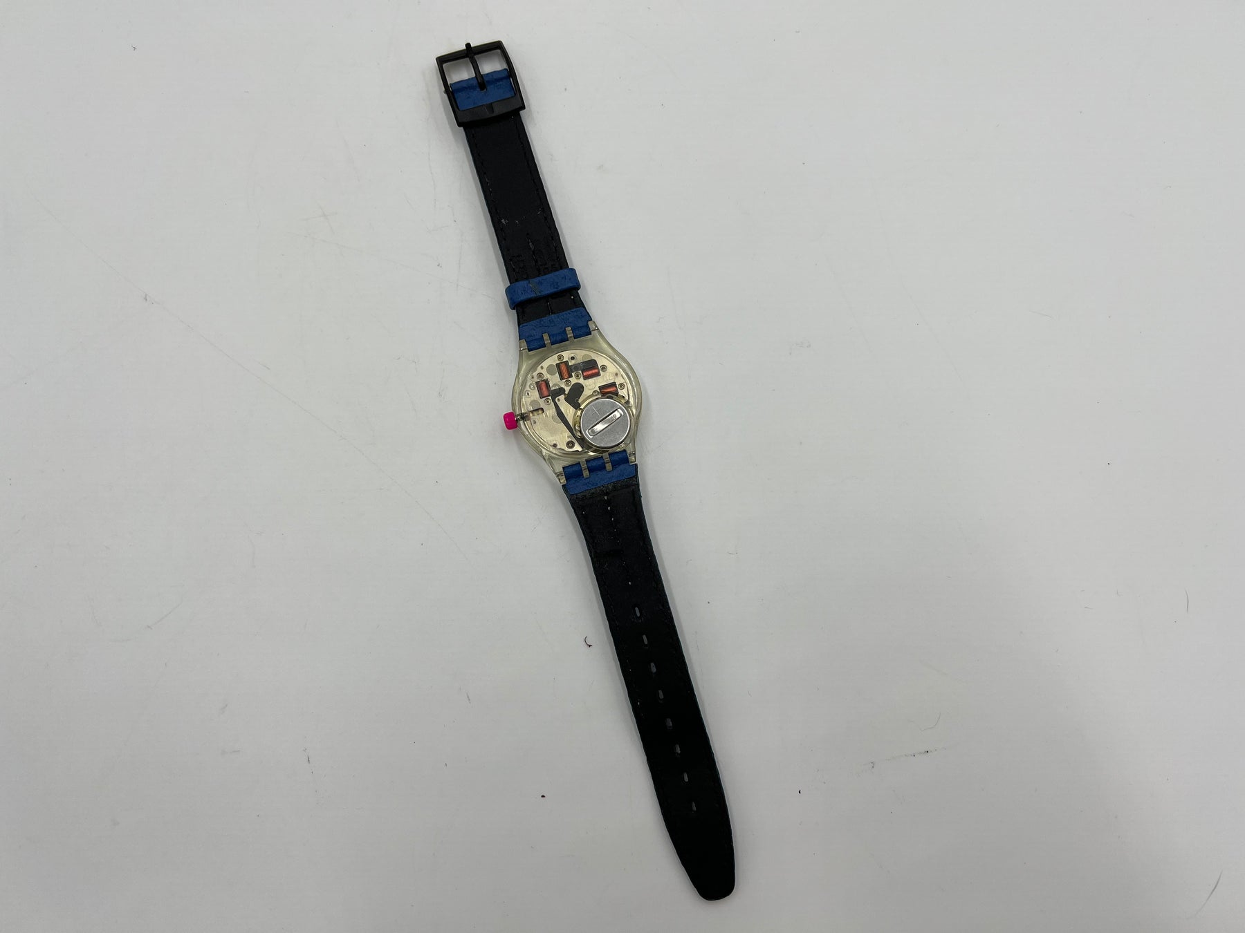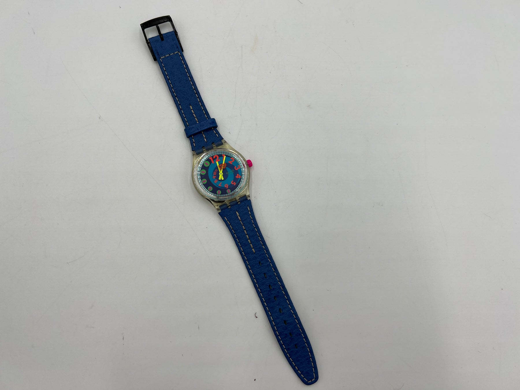 This vintage Swatch Originals wristwatch is a unique addition to any collection. The blue leather band complements the blue and multicolor dial, which features a quartz movement. The watch is suitable for both men and women and is perfect for any occasion. The metal flash design on the watch face adds a touch of retro style. This item is a must-have for any watch enthusiast or Swatch fan.