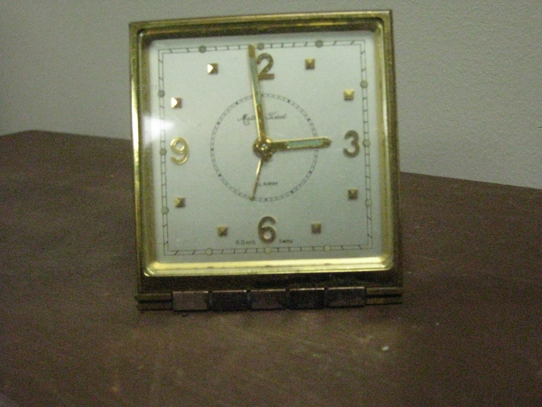 For Sale: g233 1980s Mathey Tissot 8 Day Miniature Clock PLEASE READ ENTIRE DESCRIPTION BEFORE PURCHASING Please see pictures for more detailsspecifics; height: 3 in Clock Face Overall: 2 1/2 x 2 1/2 in Length: 3 in Width:3 in weight:0.77 lb Working: yes Color: white/gold Year made:1980s Material: metal Country Of Origin: Switzerland