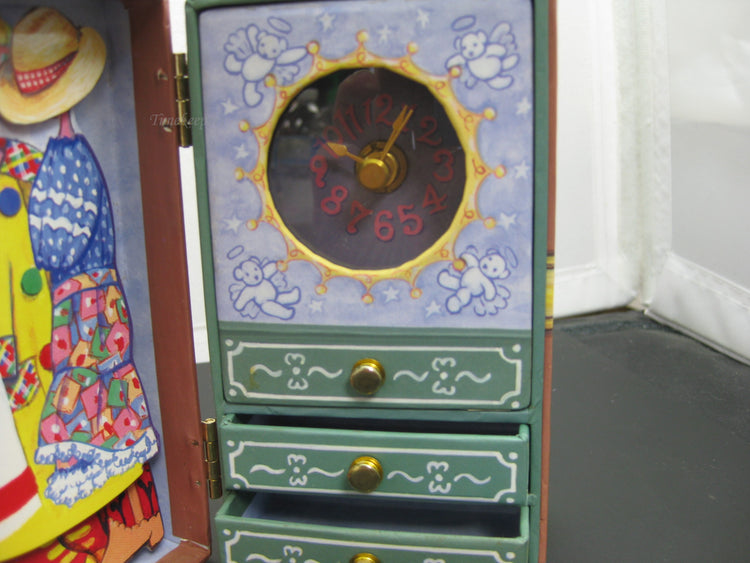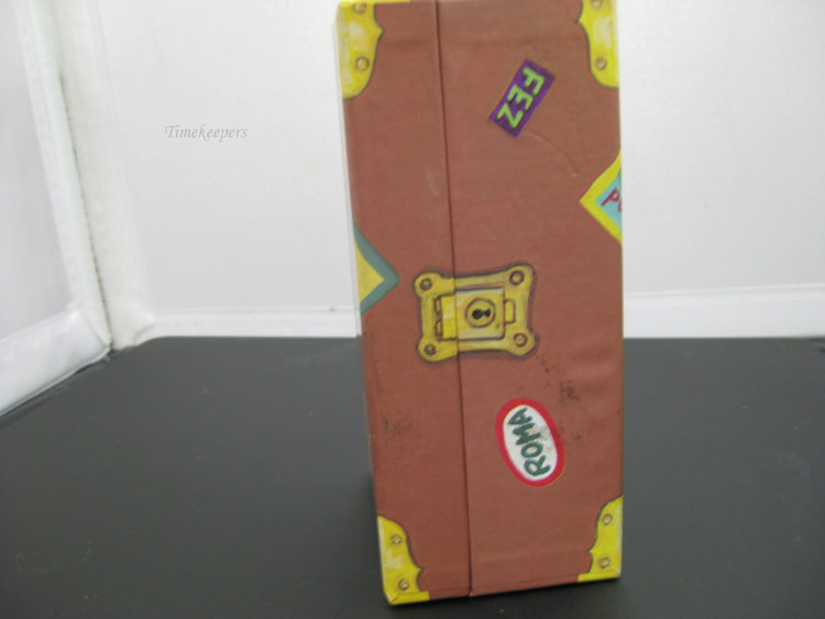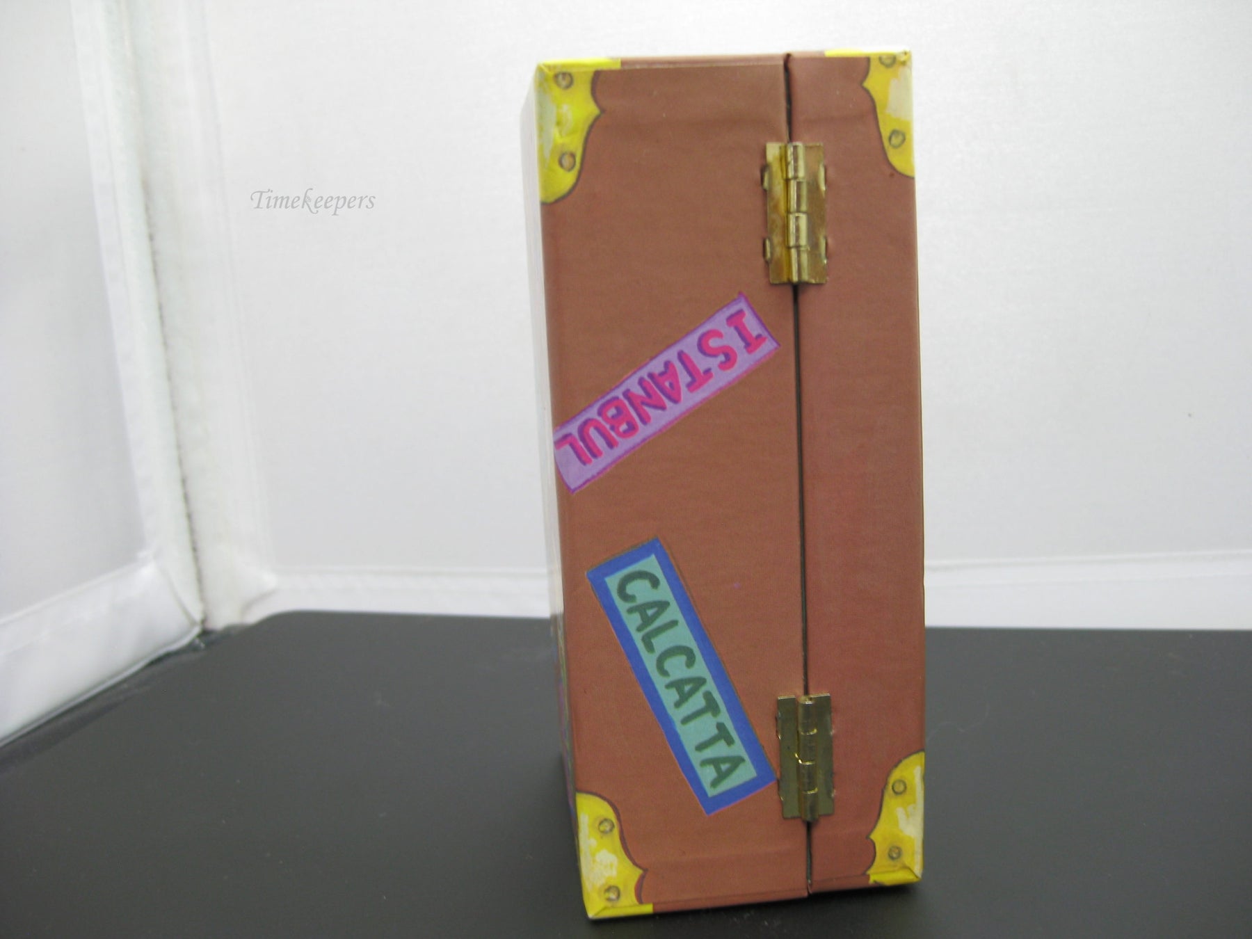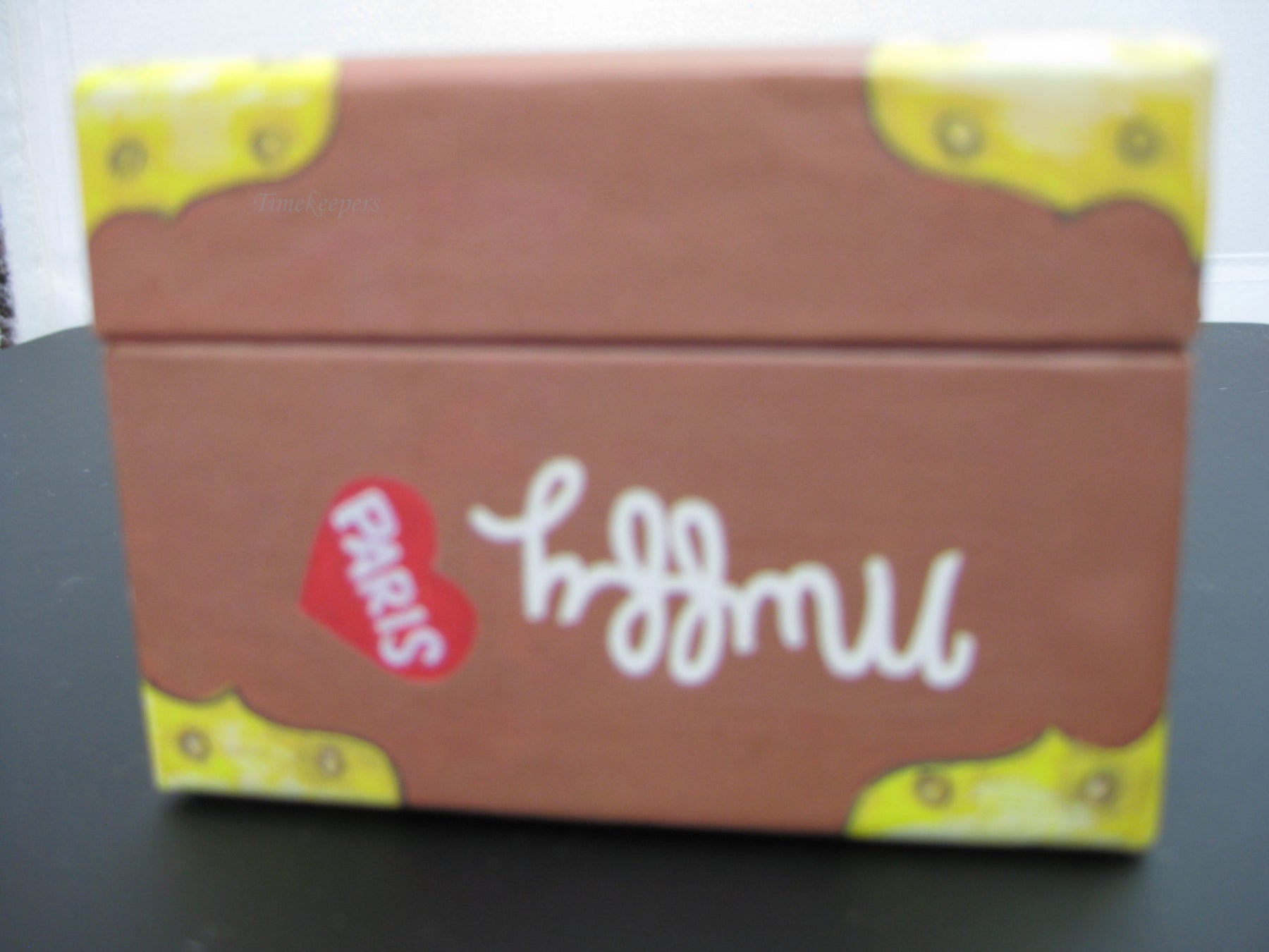 This is a cute little faux steam trunk features a removable clock and two drawers inside for storage of small trinkets. The box is marked Muffy VanderBear 1998 Club Gift, 1997 North American Bear Co., Inc. Made in China. The clock is working. The lock features a light blue background with pink numbers.