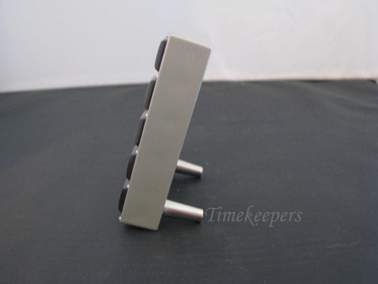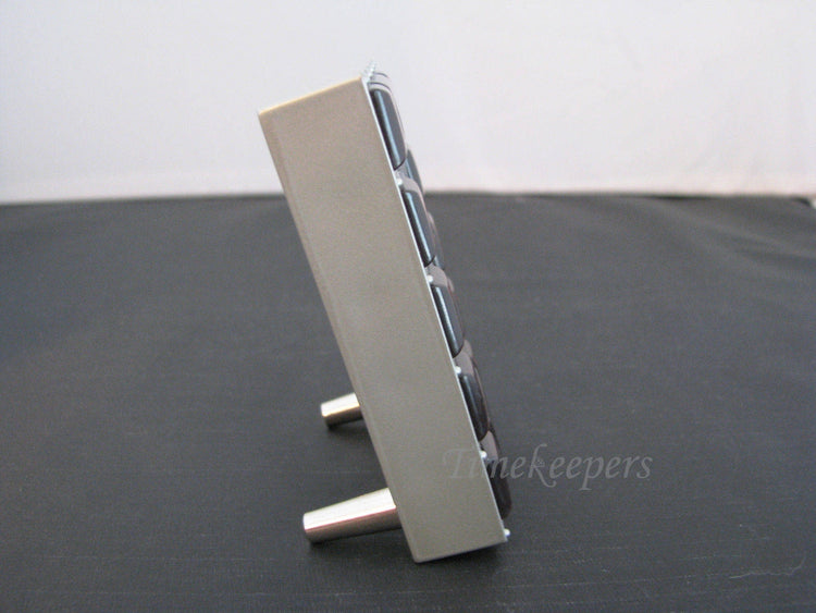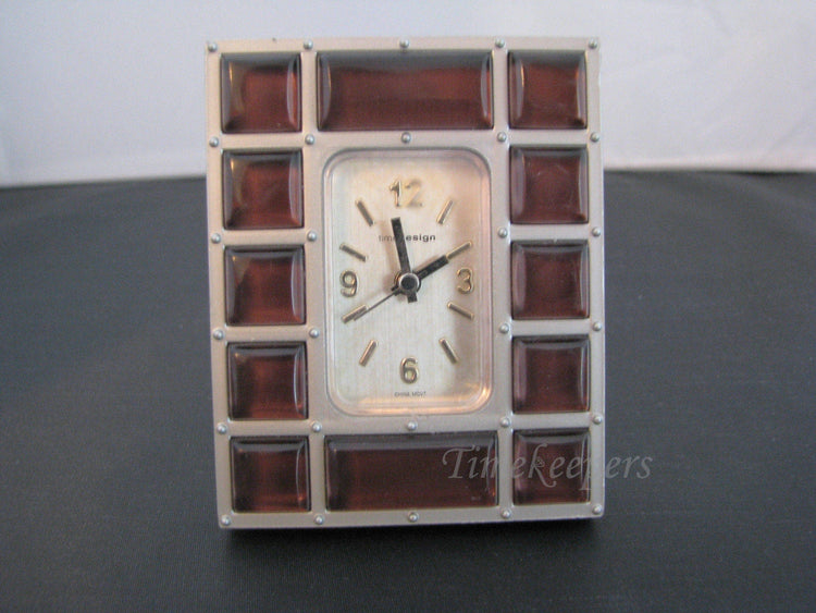 This nice rectangle desk or table top clock is in a silver resin or hard plastic with brown square and rectangle plastic gems o make a frame. This lovely little clock is by Time Design with a movement made in china. Two cute silver tone legs extend from the bottom back to provide a secure standing position. The protective plastic sheet is still over the face of both clocks. This is a battery operated clock.
