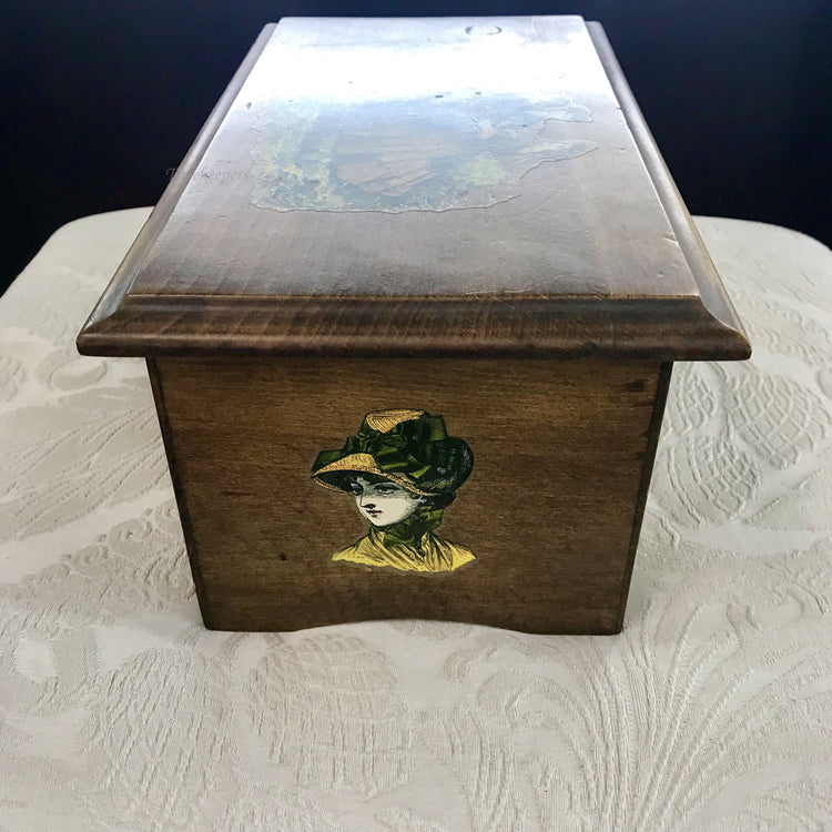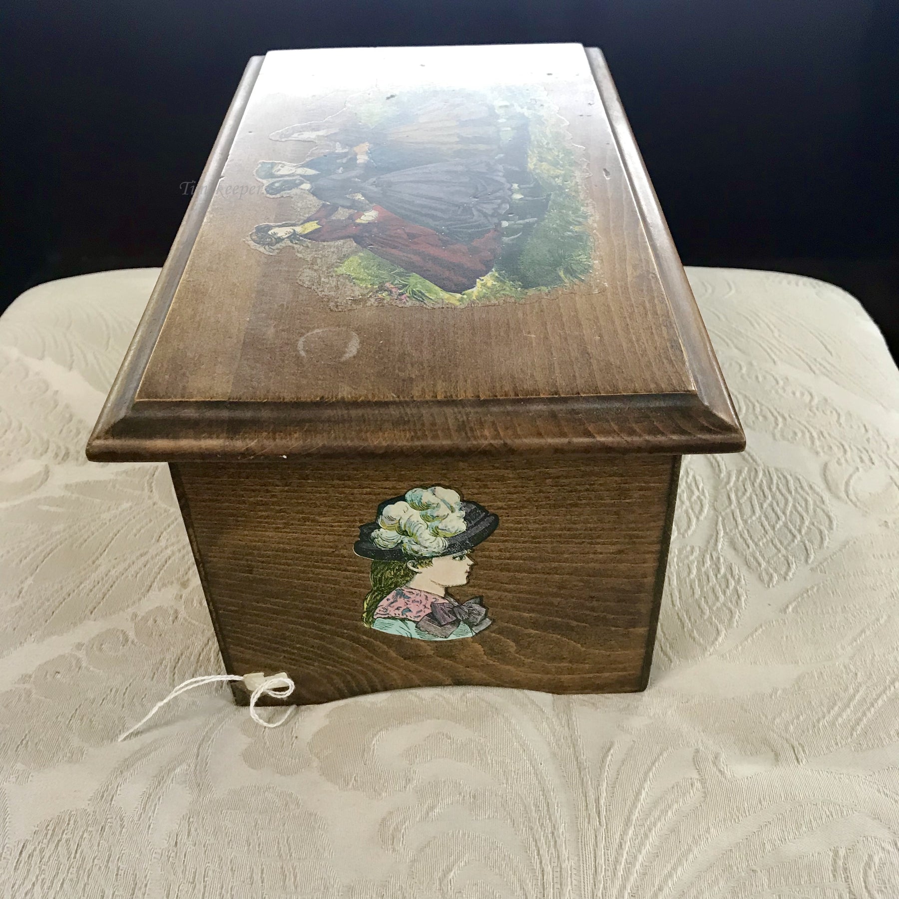 Vintage music Box. Swiss. 1900s. Great working condition Comes without a key, snap closure, comes with 14, 4.5" discs - El Captain March - Down in the Farm - Wrap The Green Flag Round Me Boys - Humoreske - The Sunshine Of Your Smile - Ain't We Got Fun Song - Roses A Twilight - Auld Lang Syne - Golden Foxtrot - Marche Des Petits Pierrots - Waves of The Danube Waltz - Meditation - Tour Are The Only - My Little Hindoo Bell Approximate measurements. 12" x 7" x 5.5"