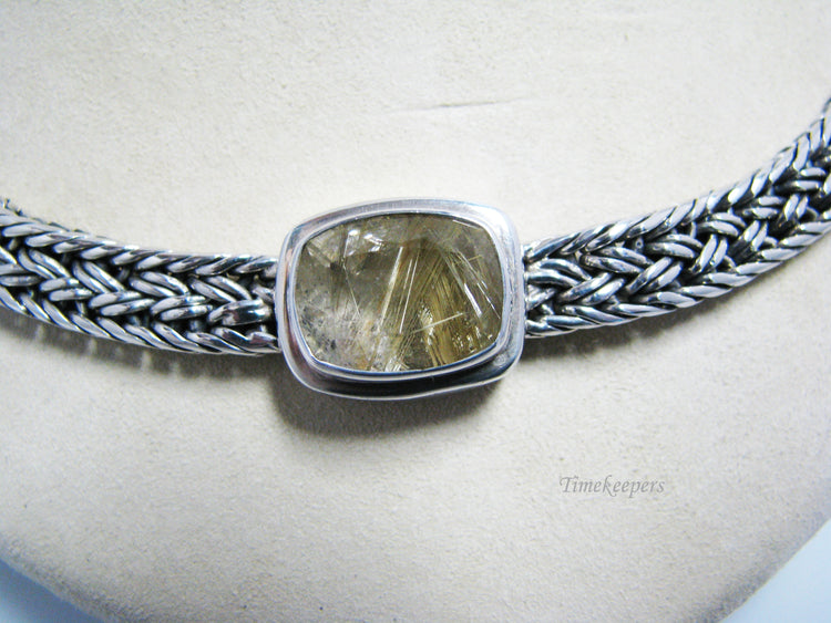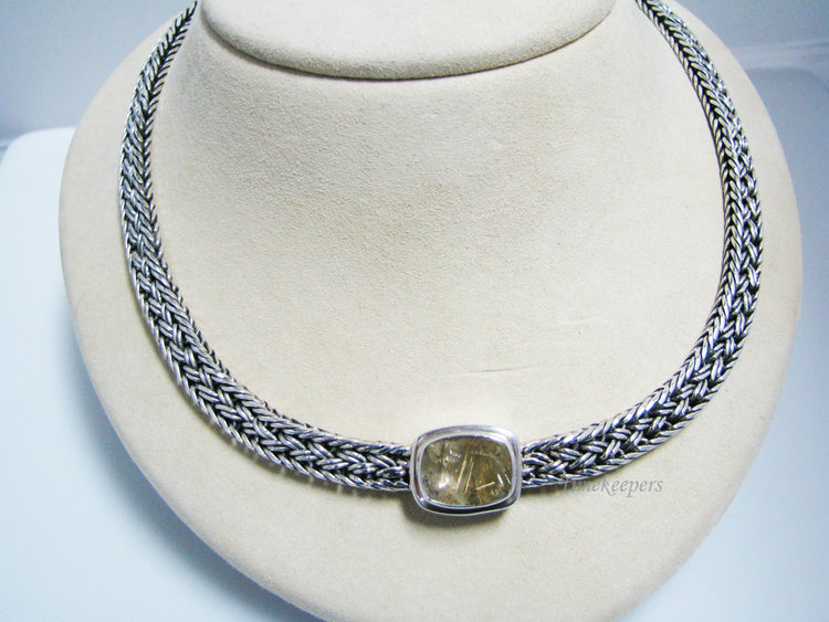 This is a beautiful unique necklace featuring a cabochon set quartz stone on a heavy woven chain.